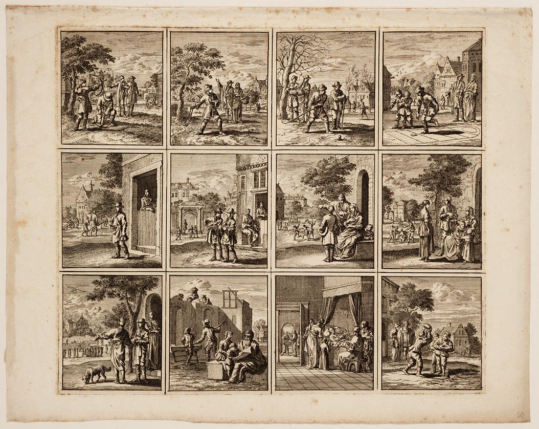 Blad met 12 prenten uit de emblematabundel "Des mens...