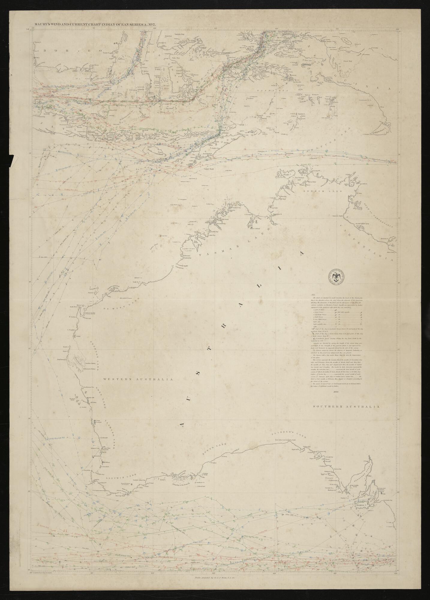 Gekleurde Maury's wind- en stroomkaart van de Indisc...