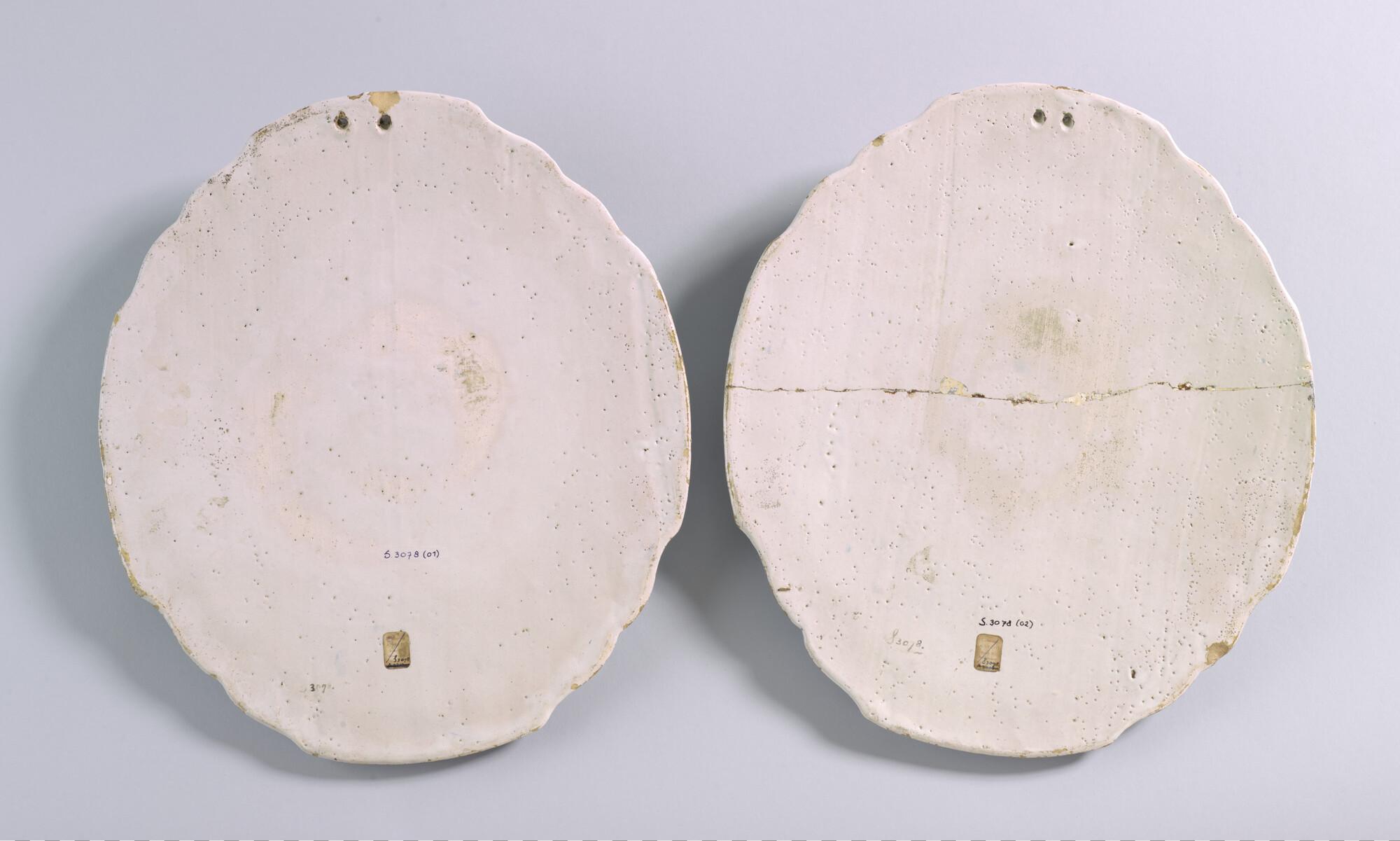 Plaque van Delfts aardewerk met een gezicht op het I...