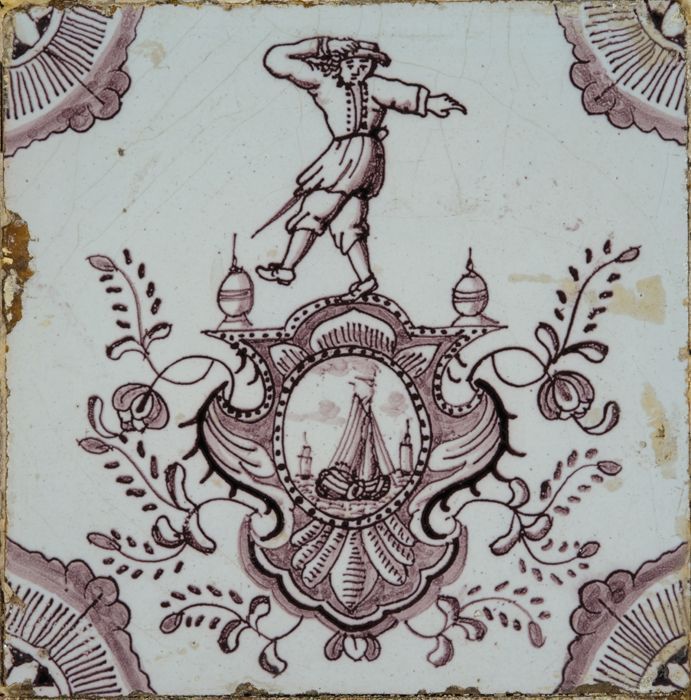 Figuurtegel, in blauw op wit, krijgsman met spies