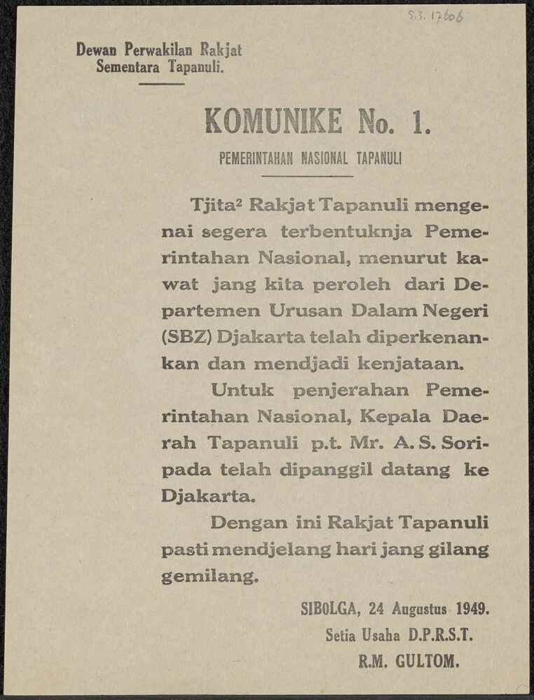 Komunike No. 1 van Dewan Perwakilan Rakjat Sementara...