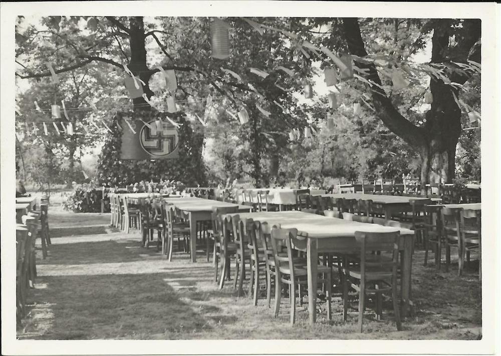 Lege tuin met lange rijen tuintafels, vlaggen en een...