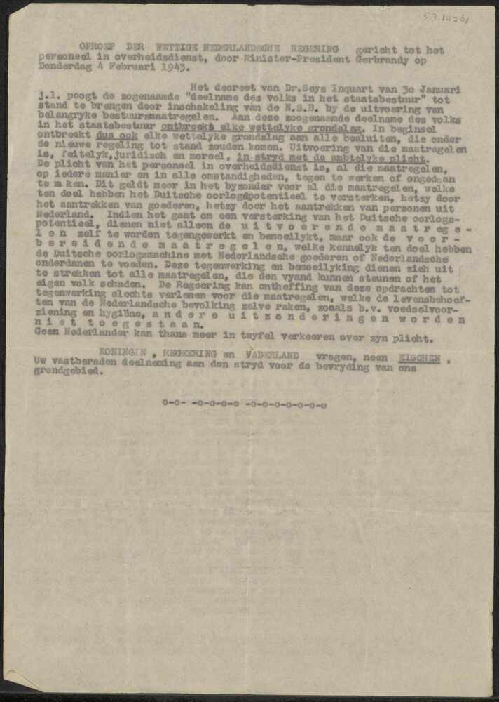 OPROEP DER WETTIGE NEDERLANDSCHE REGERING gericht to...