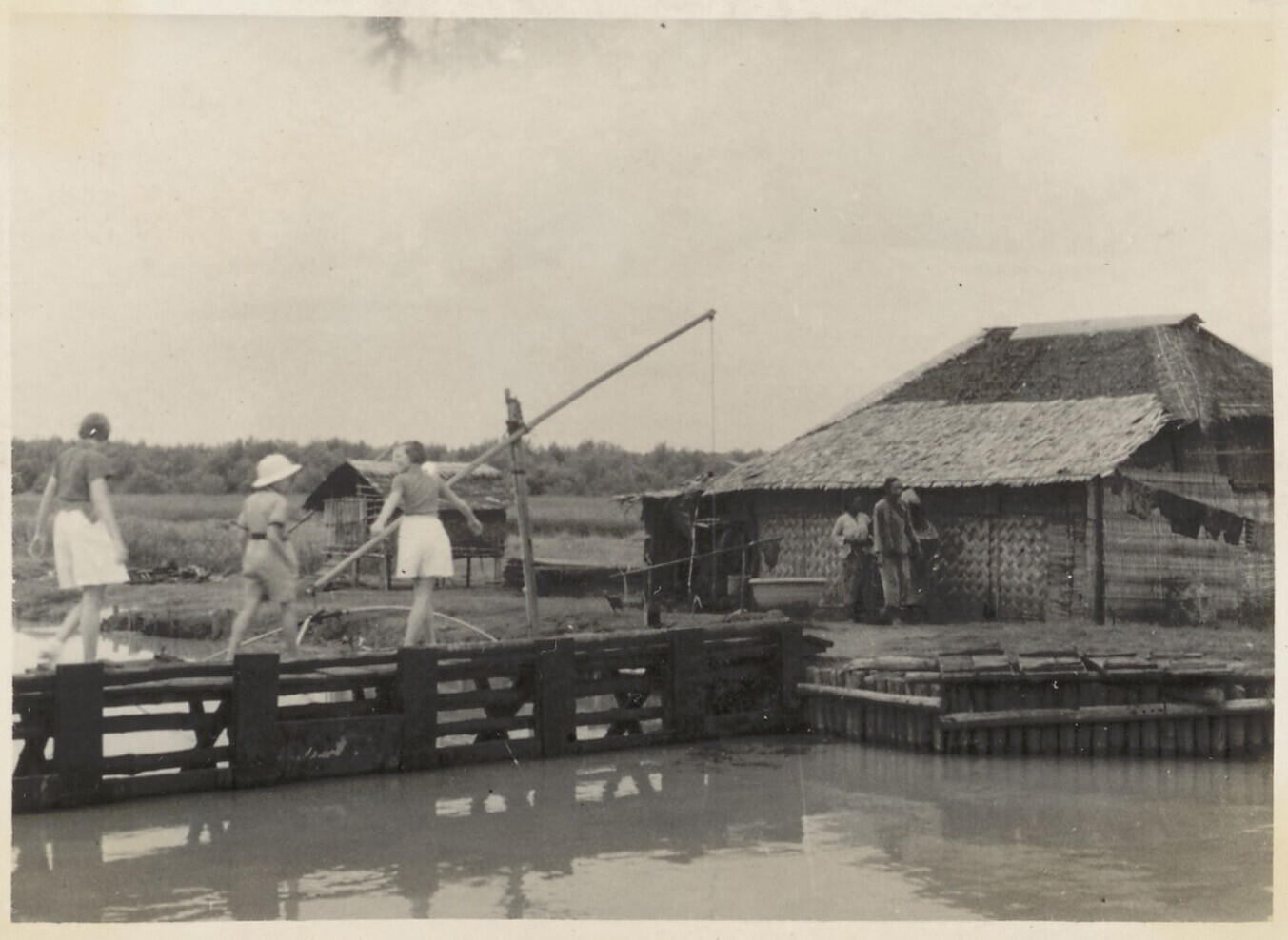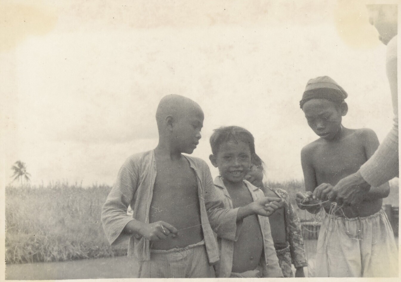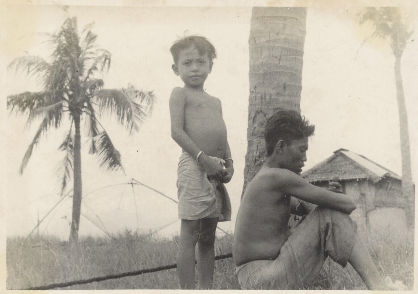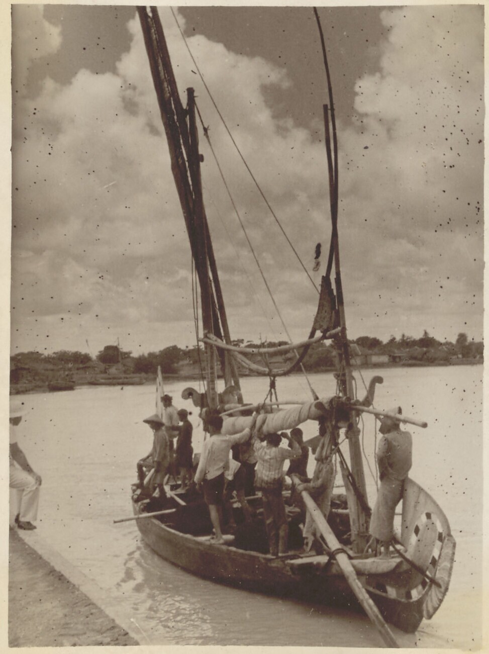 Vissersschepen afgemeerd bij Cheribon. Kano op de vo...