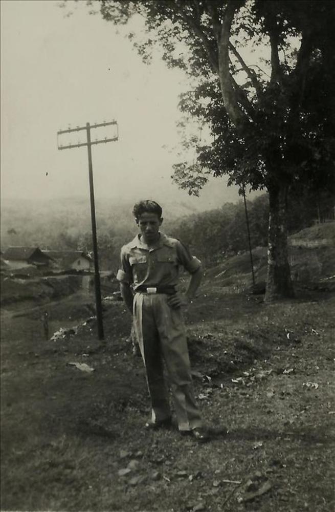 Nederlands Indië; militair poseert, telegraaf- of te...