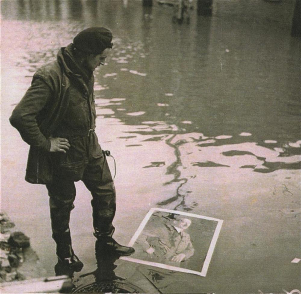Britse militair kijkt naar drijvend portret van Hitler