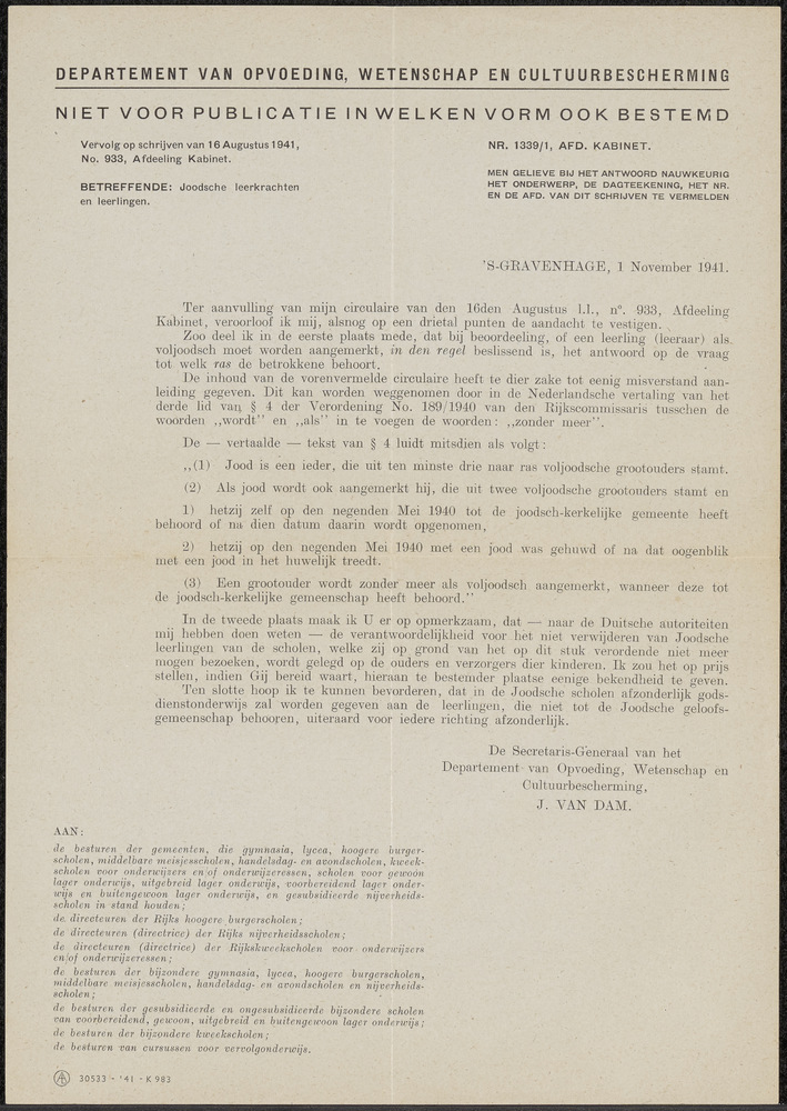 Brief van het Departement van Opvoeding, Wetenschap ...