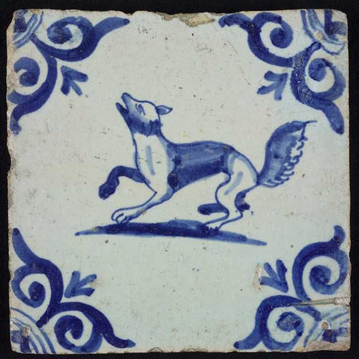 Dierentegel, blauw op wit, vos, hoekmotief grote oss...