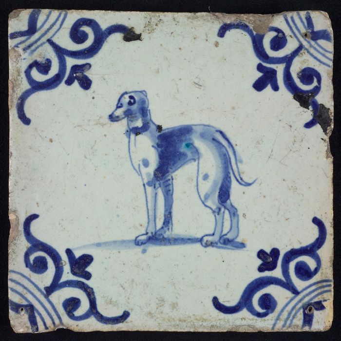 Dierentegel, blauw op wit, hond, hoekmotief grote os...