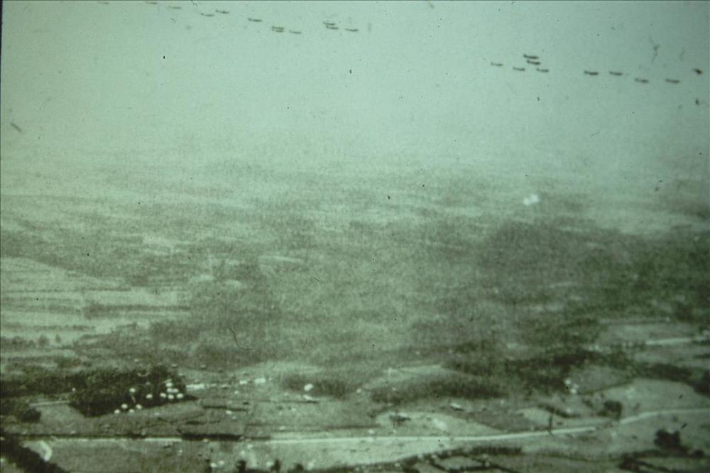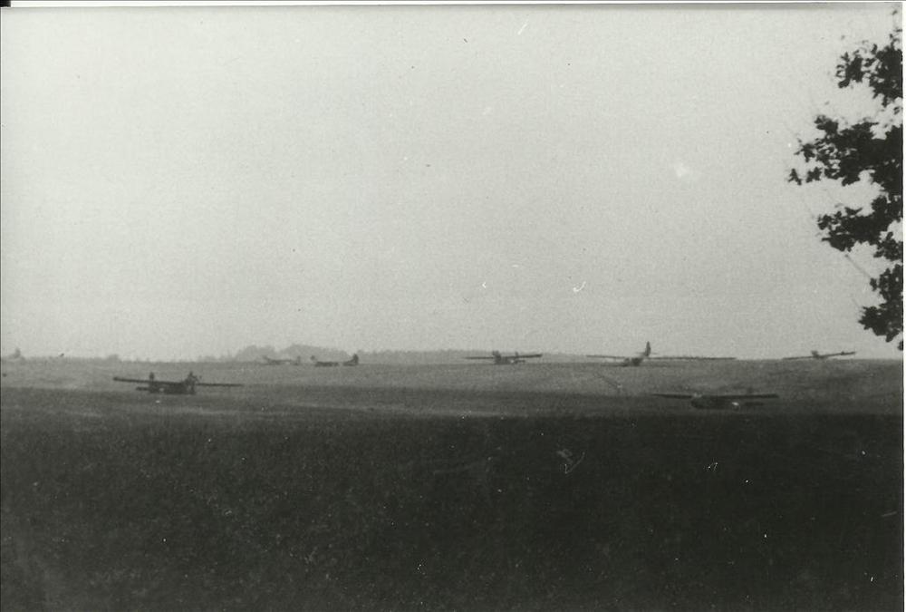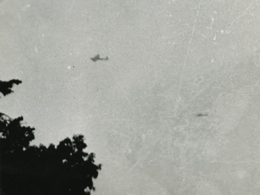 Foto van twee Short Stirlings boven bomen. Tekst ach...