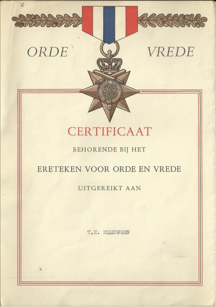Certificaat behorende bij het Ereteken voor Orde en ...