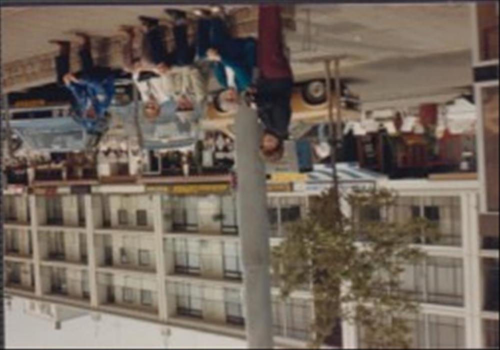 Foto van vijf peronen op zittend op een muurtje bij ...