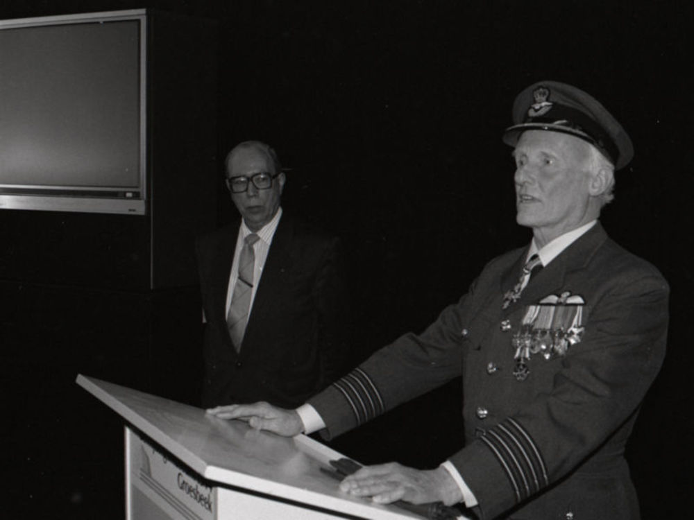 Foto van een Britse veteraan tijdens zijn toespraak ...