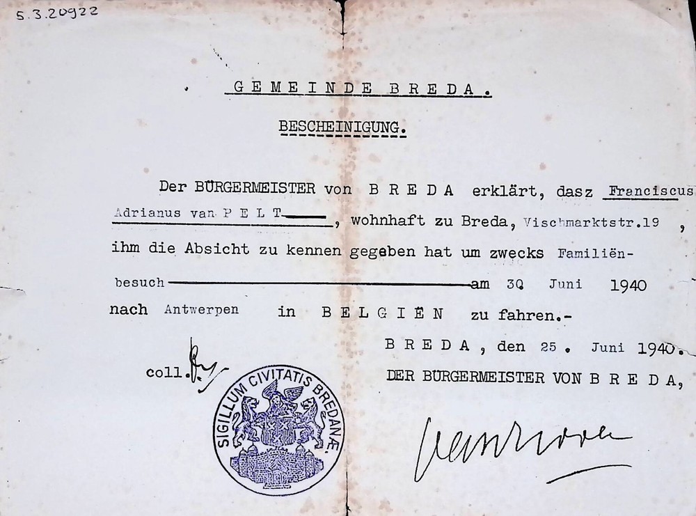Document reisvrijgeleide F.A. van Pelt, juni 1940