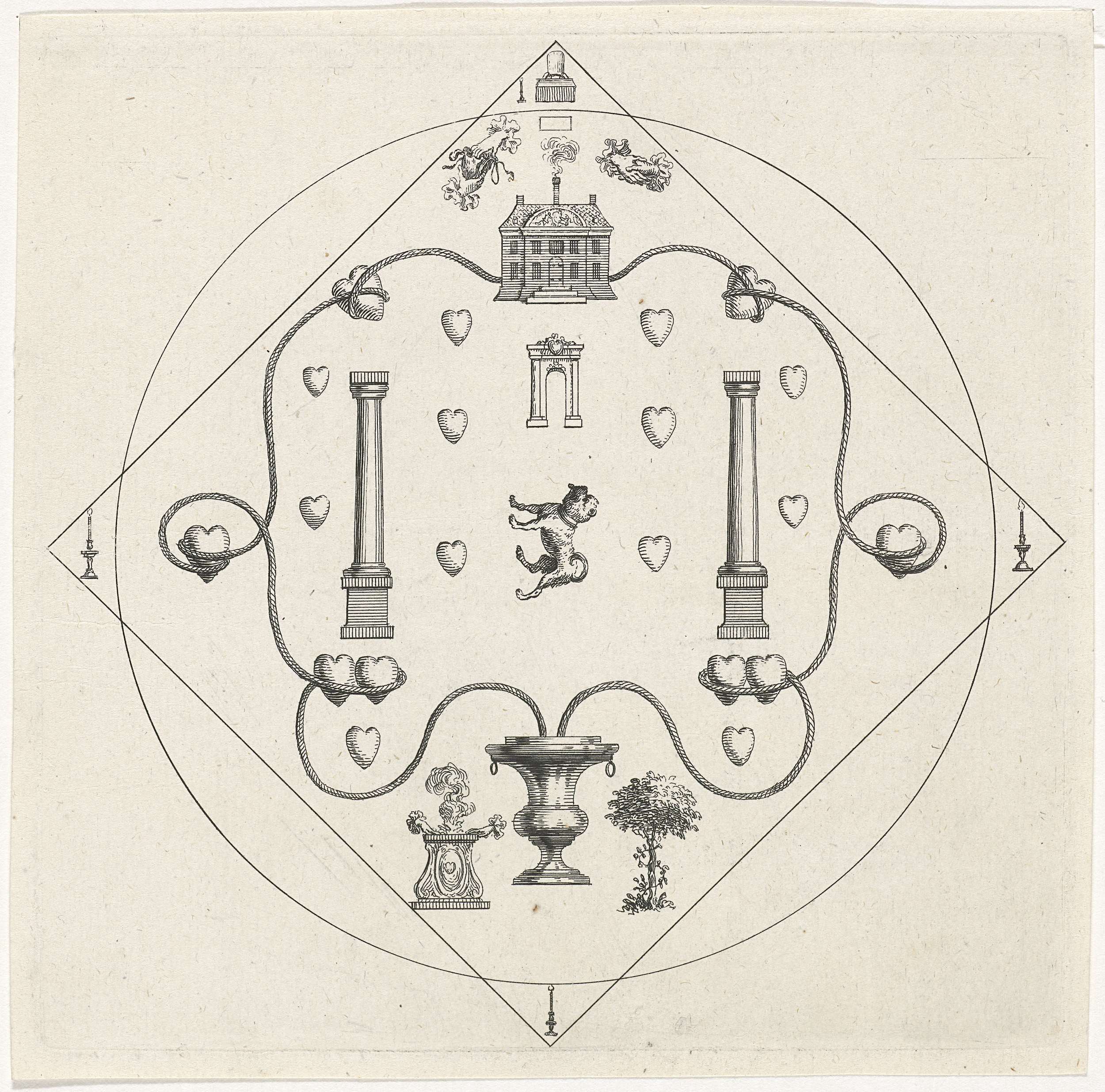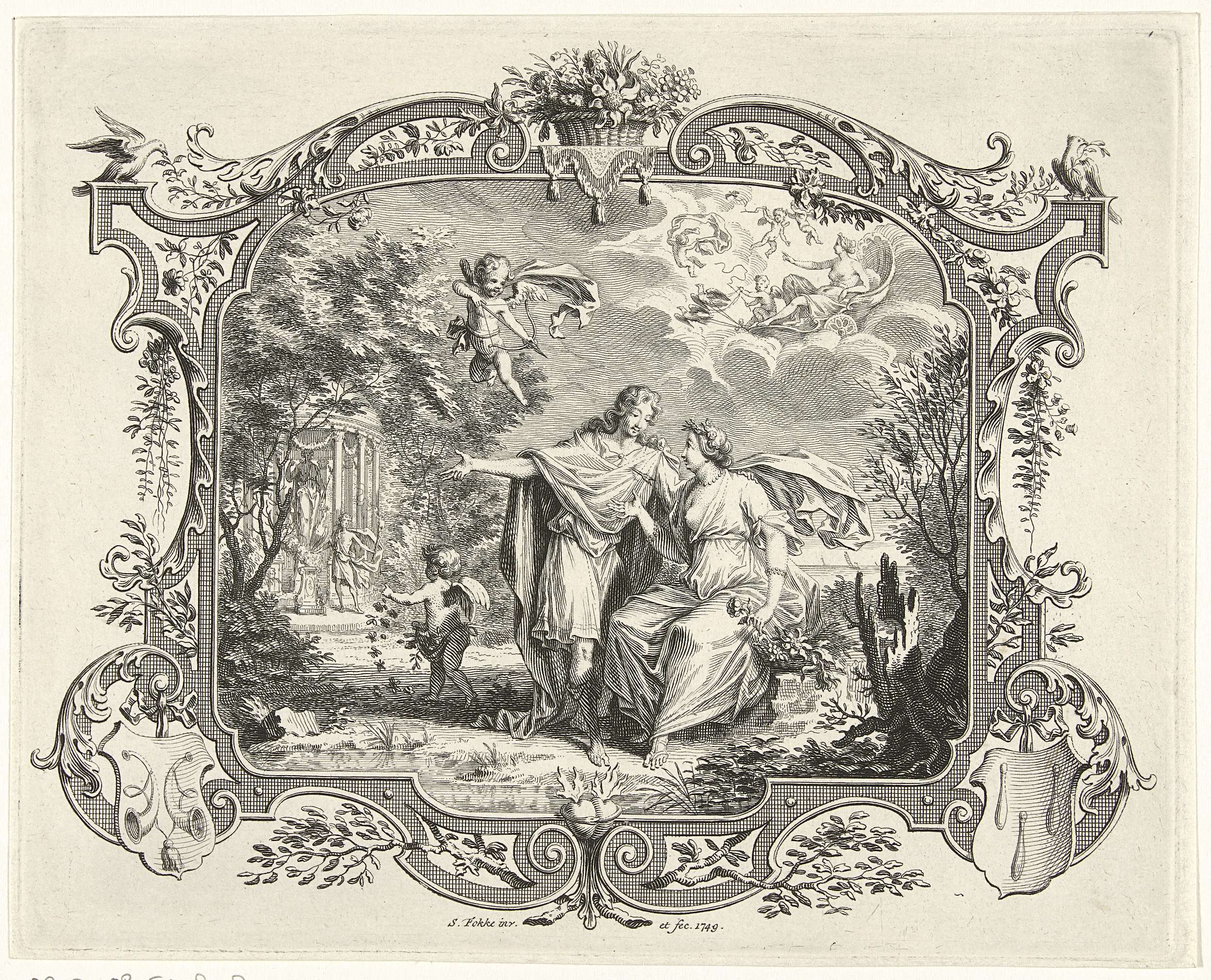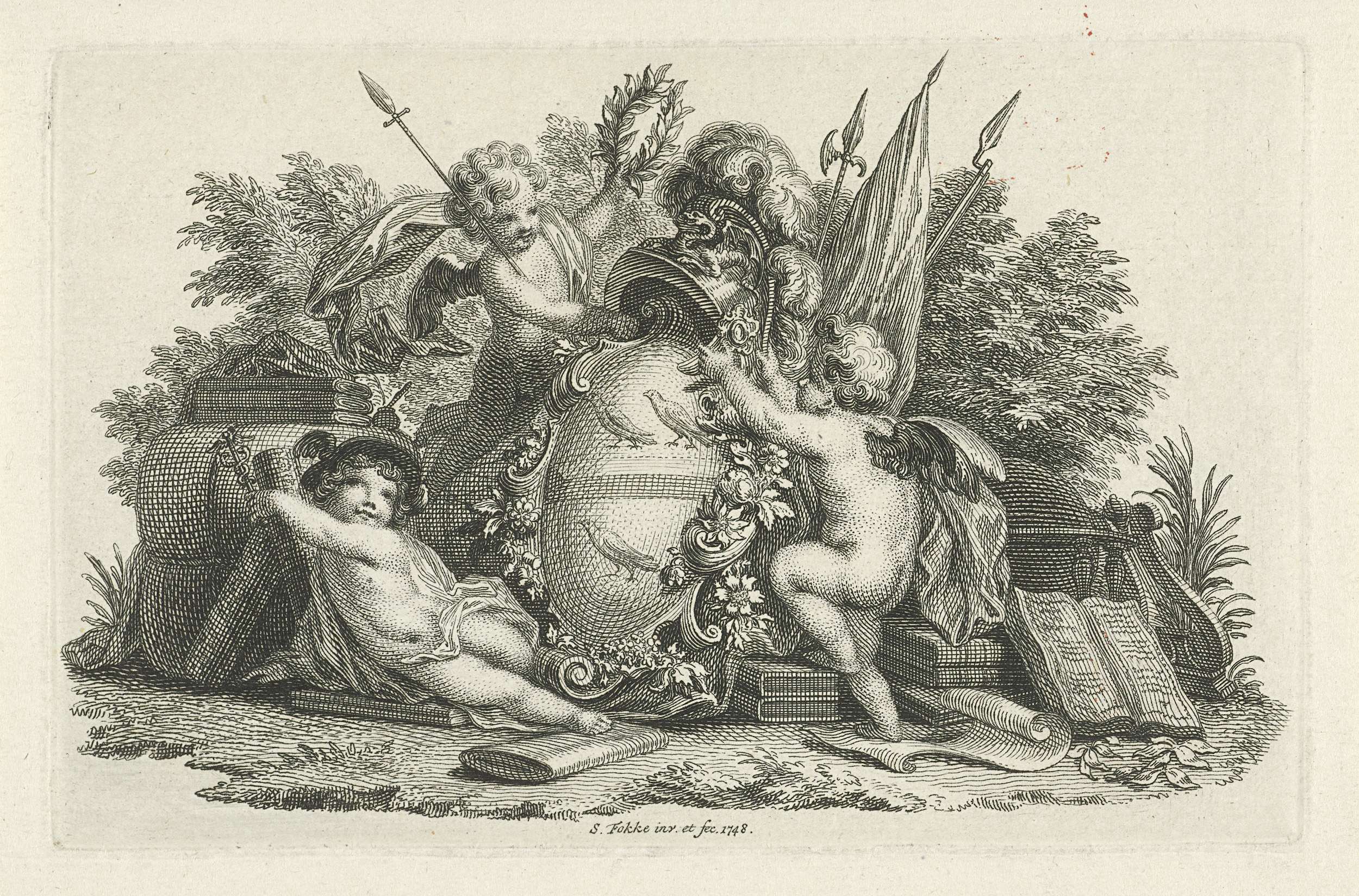 Allegorisch gedenkteken met gehelmde wapenschilden