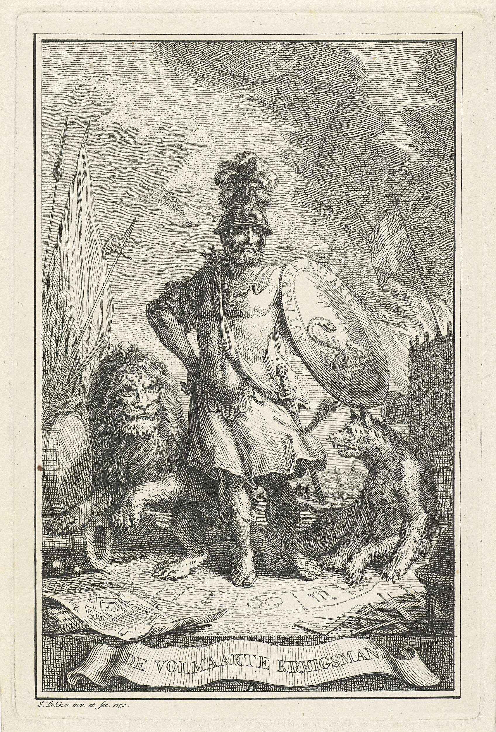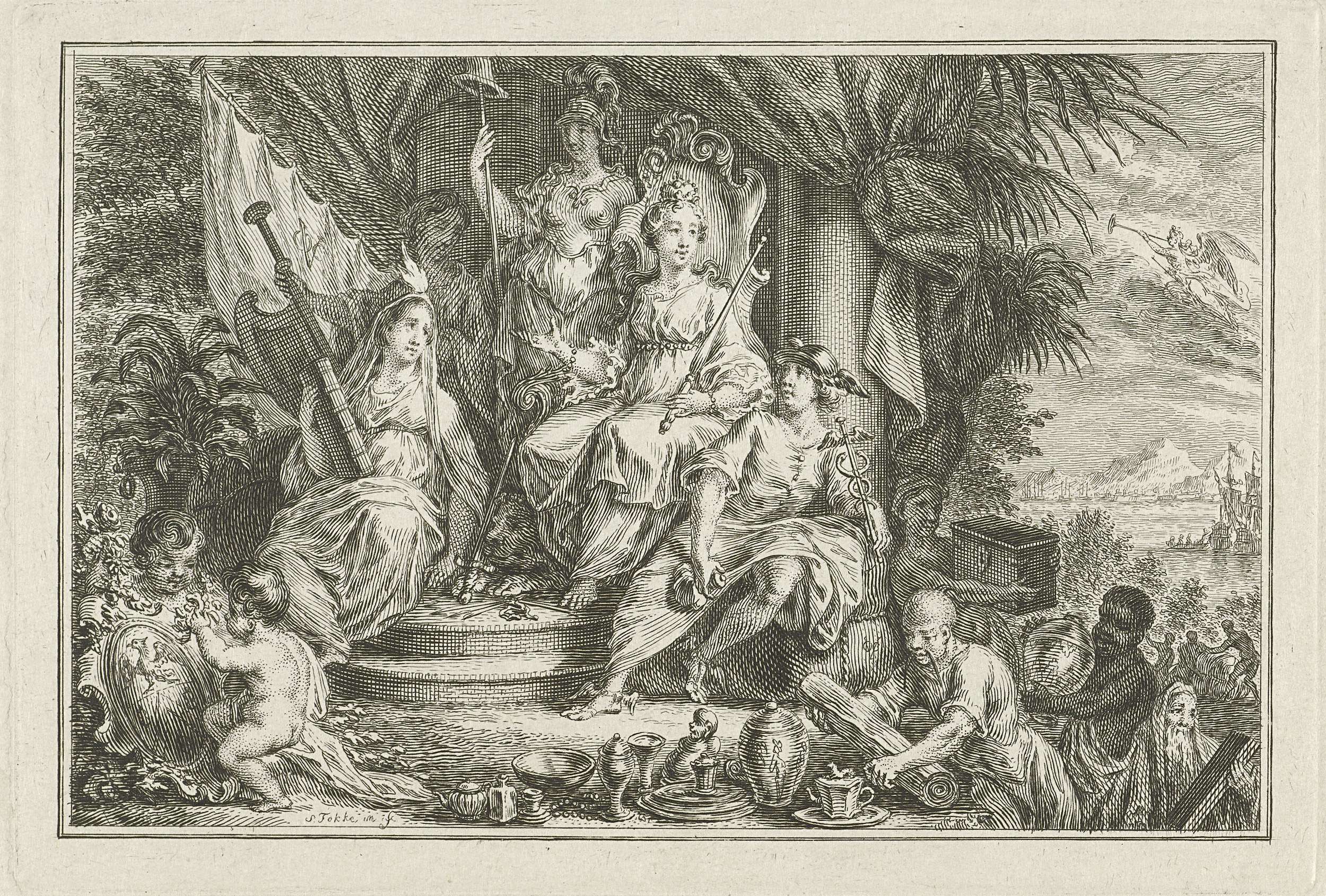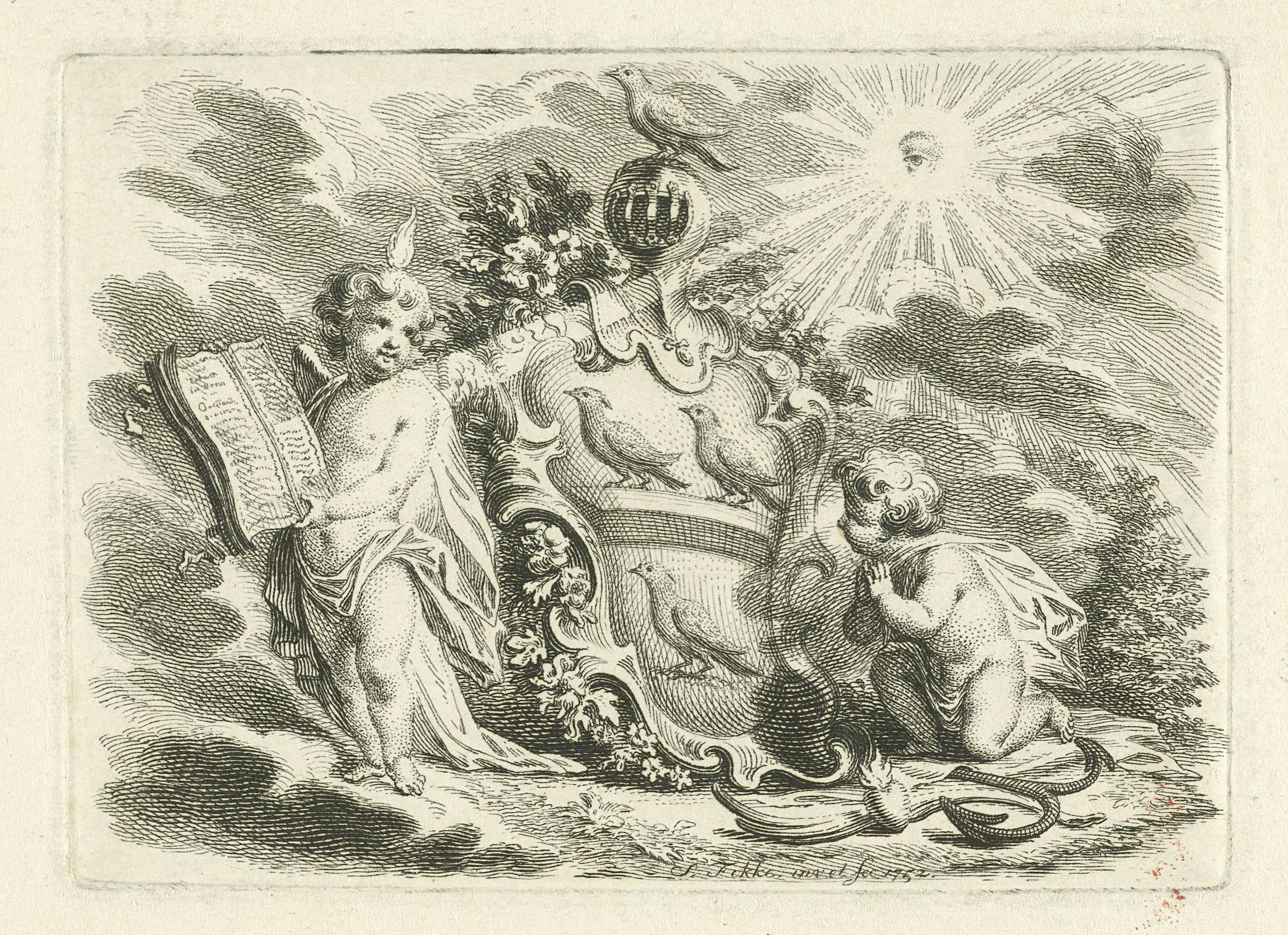 Allegorisch gedenkteken met gehelmde wapenschilden
