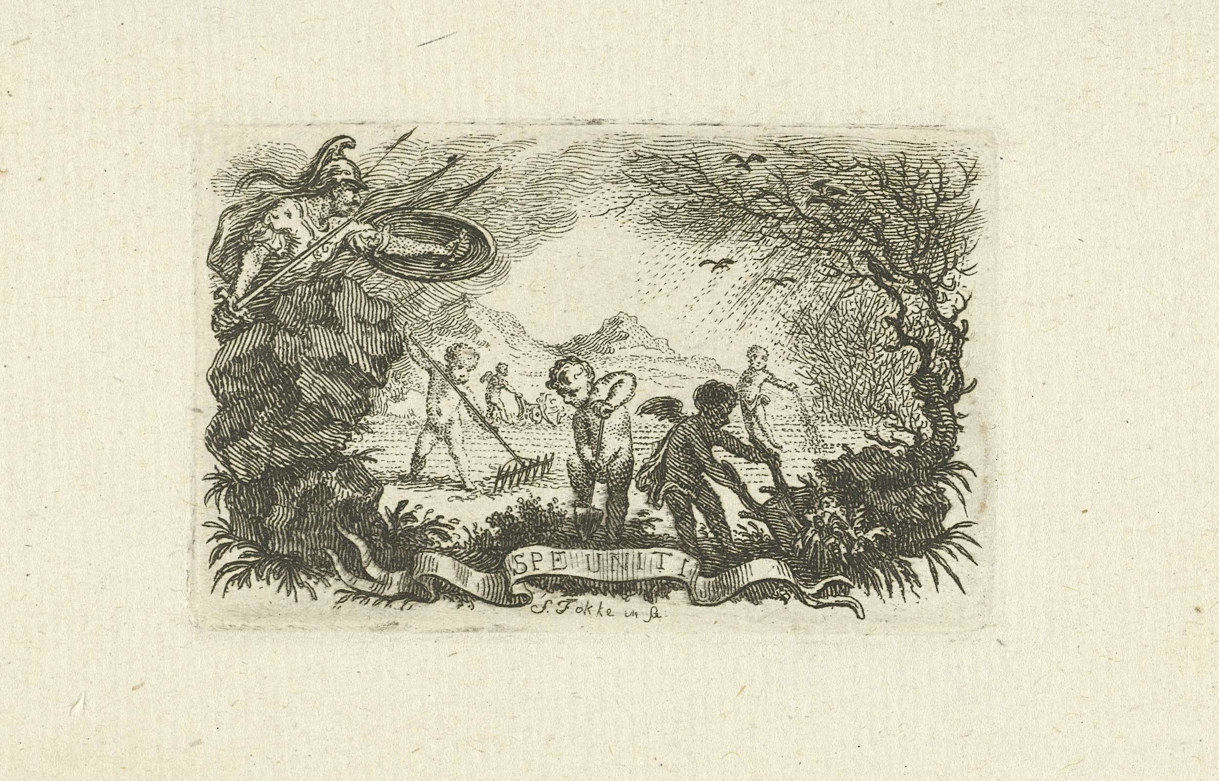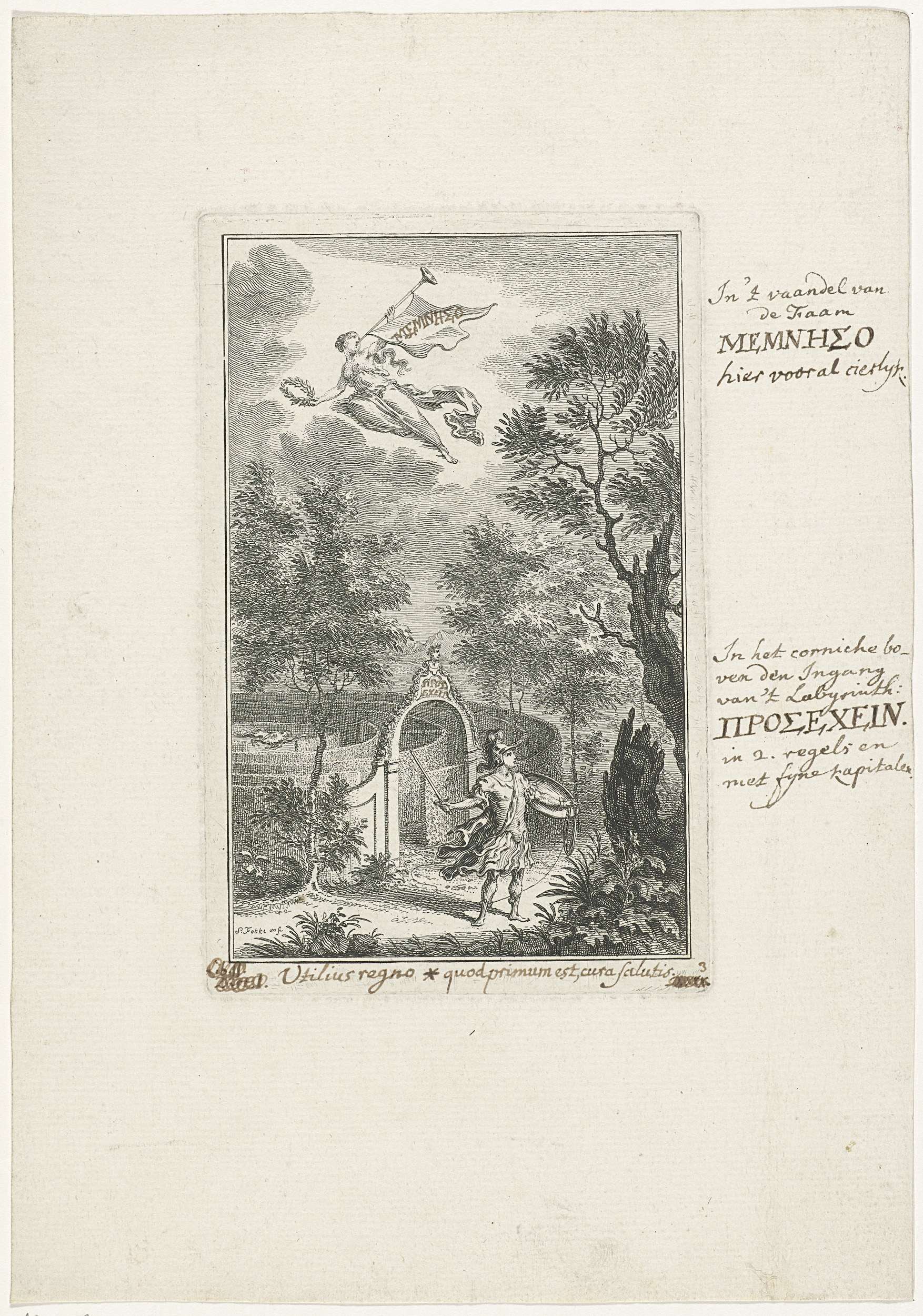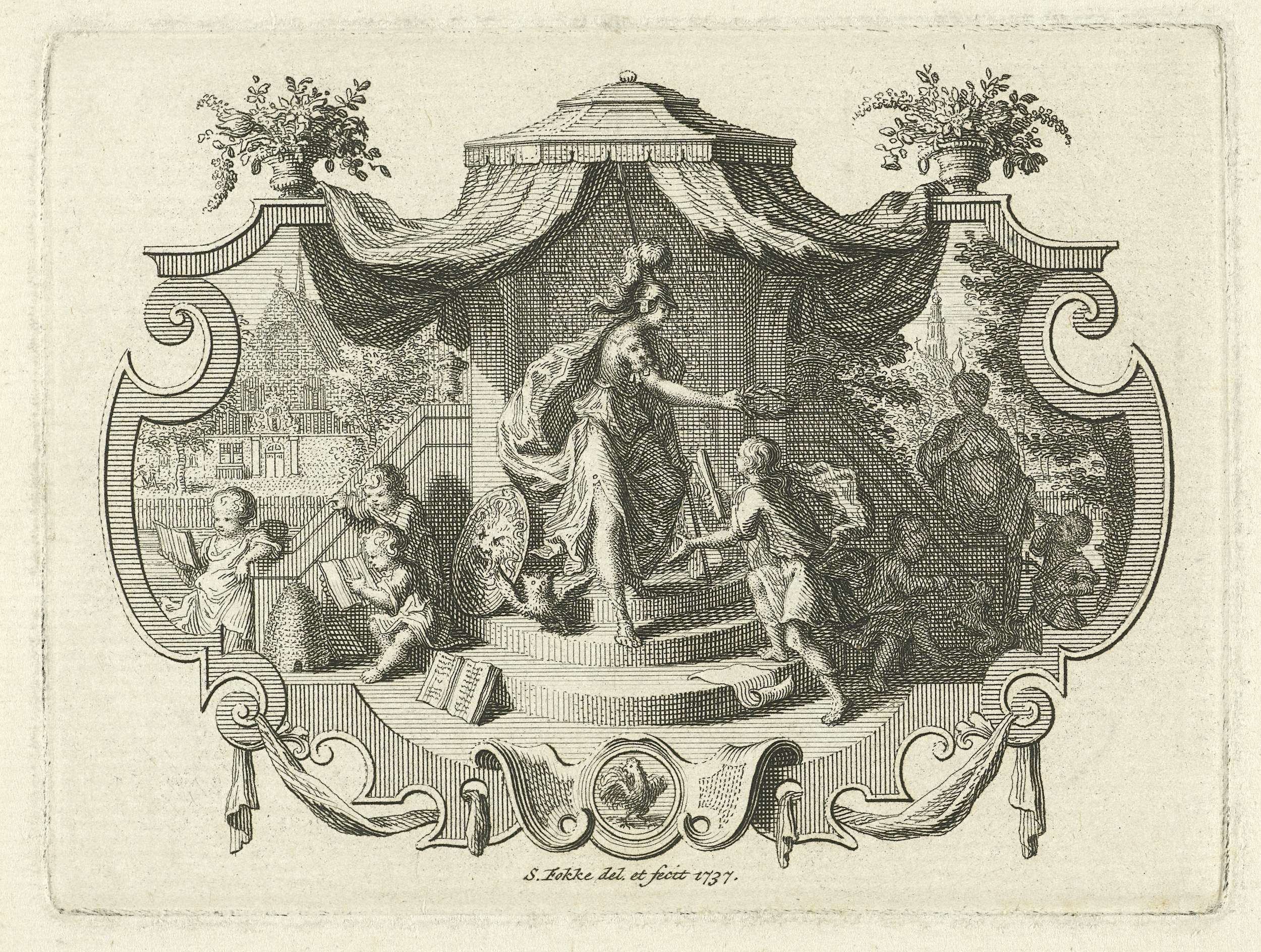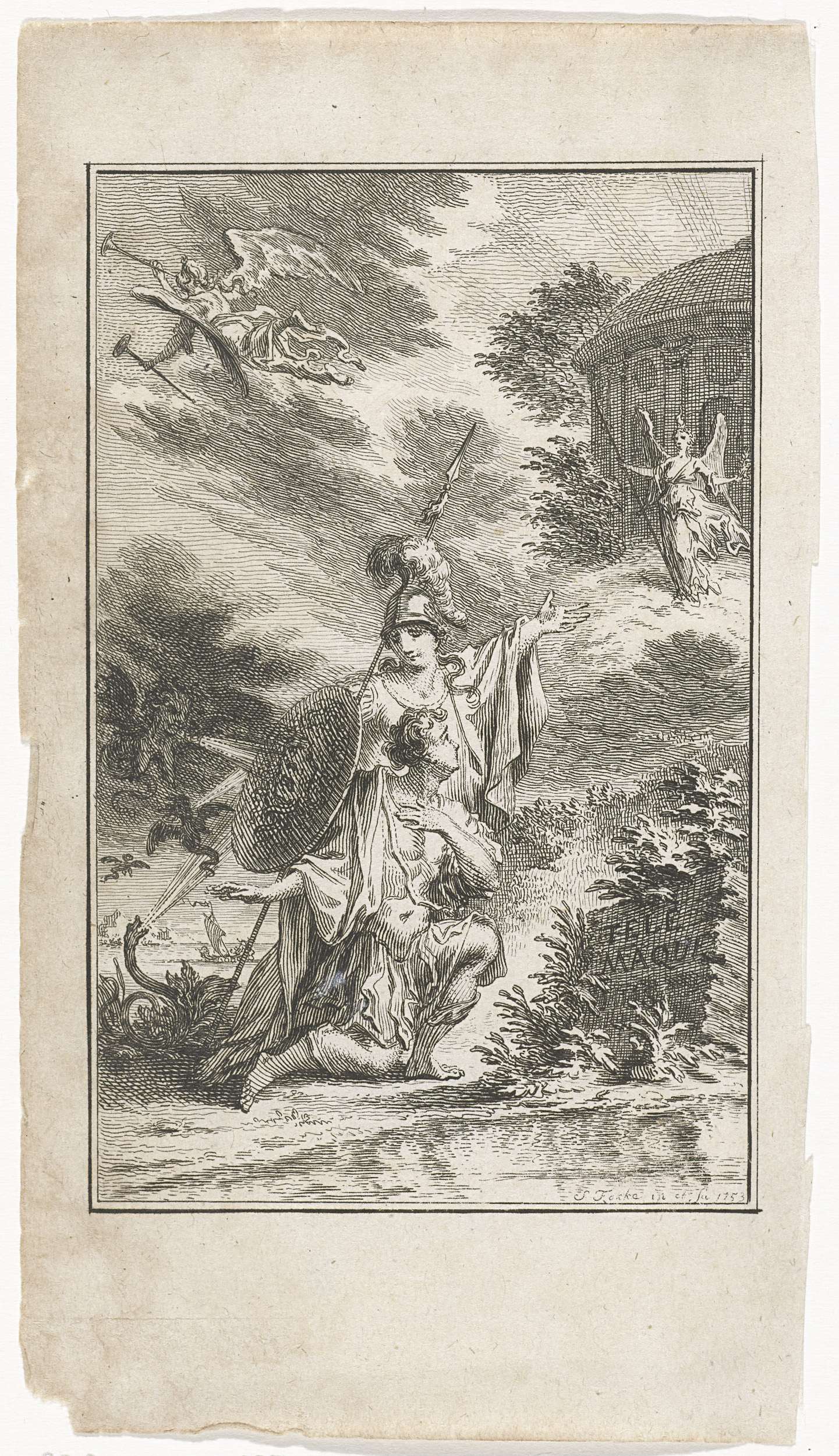 Allegorisch vignet met Minerva die een jongeman lauwert