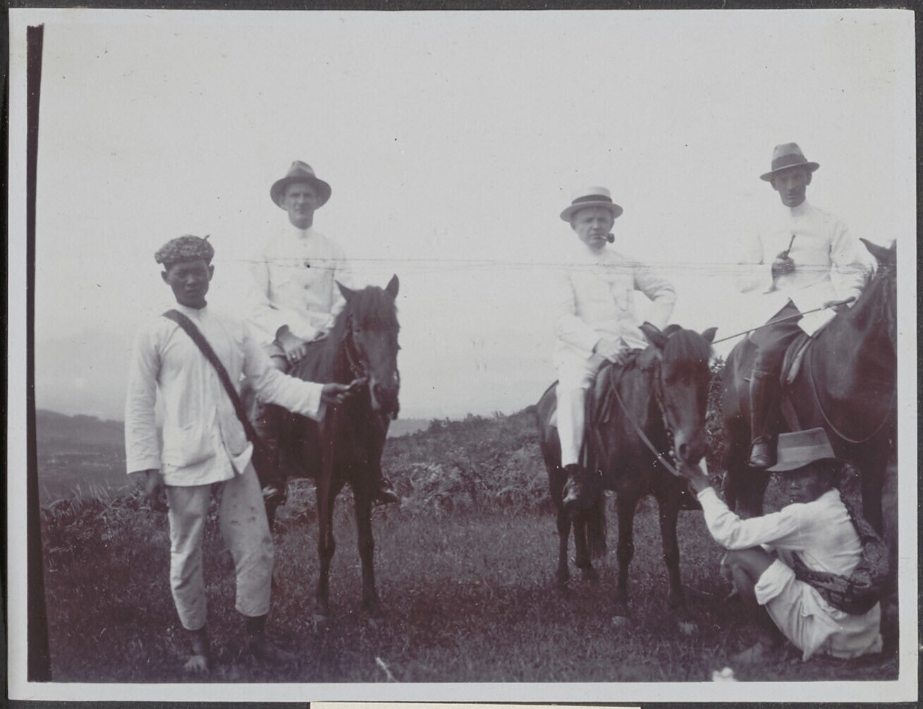 Drie mannen te paard met helpers