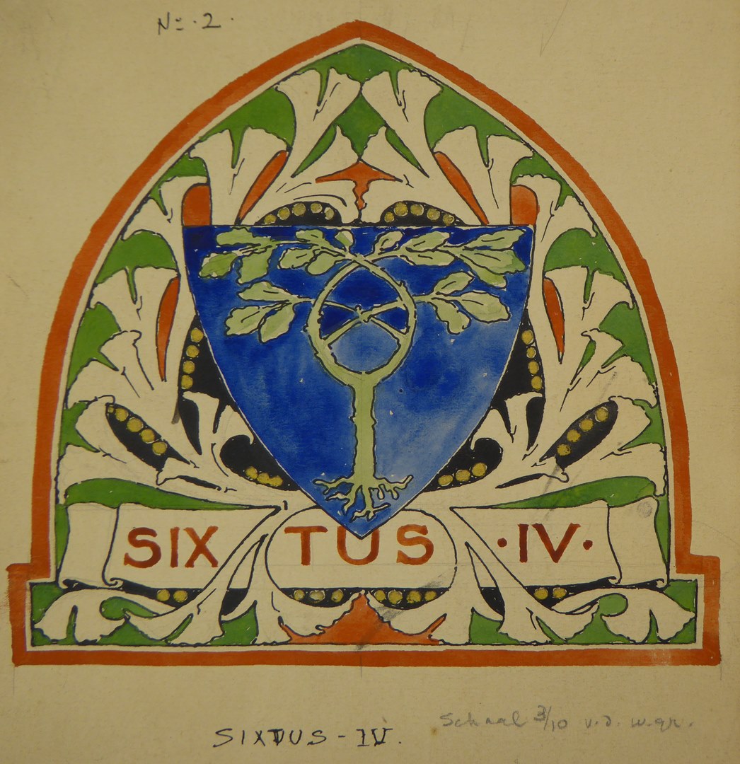 Tekening met schild met boom en "No. 2 Sixtus IV"