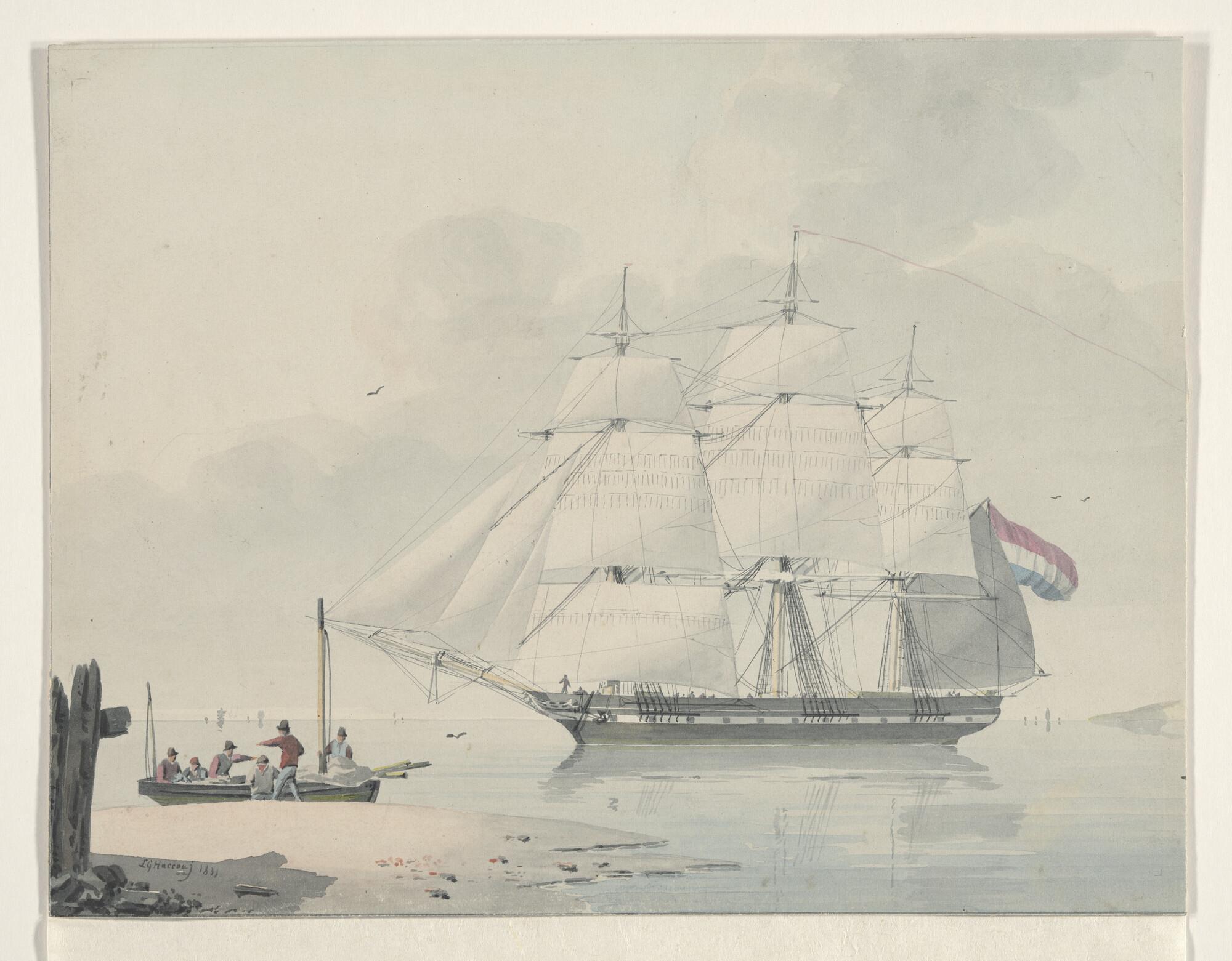 Een oorlogsfregat op een rede bij stil weer