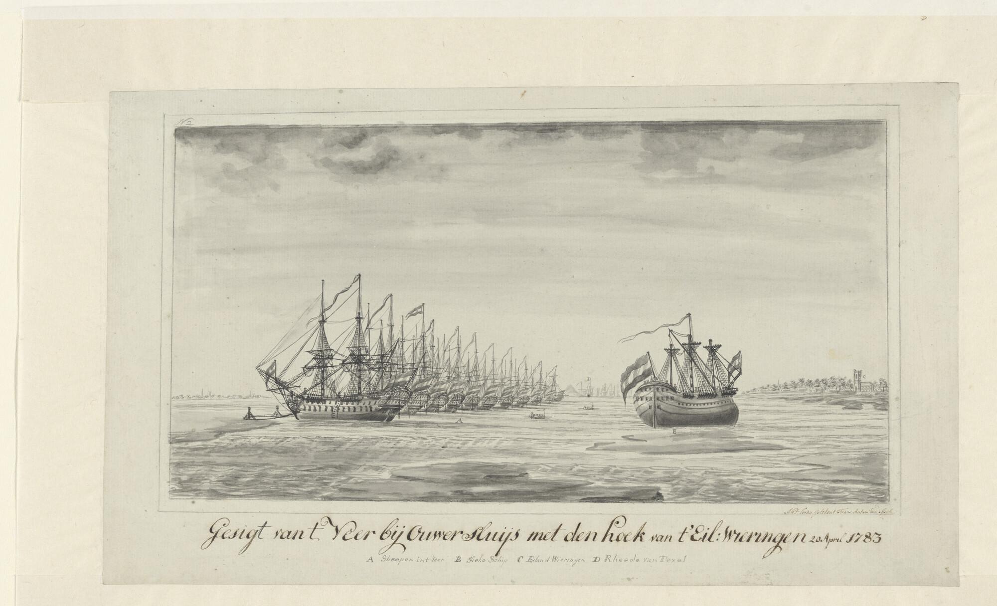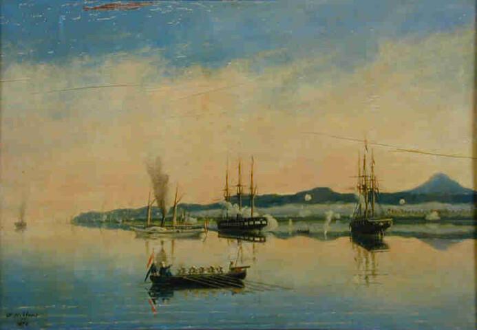 Een eskader oorlogsschepen voor anker bij het eiland...