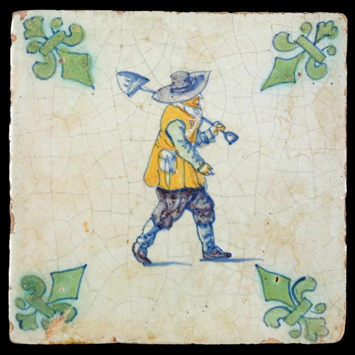 Figuurtegel, lopende man met schop, hoekmotief groen...