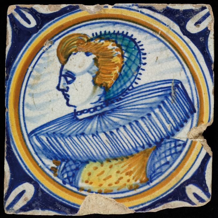 Figuurtegel, afbeelding vrouw met molensteenkraag in...