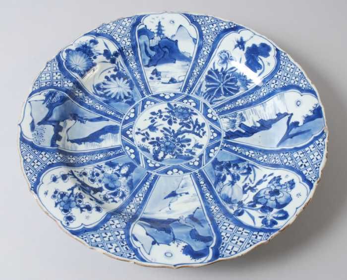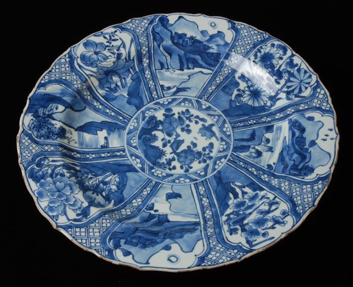 Grote porseleinen schotel met in blauw Aziatische la...