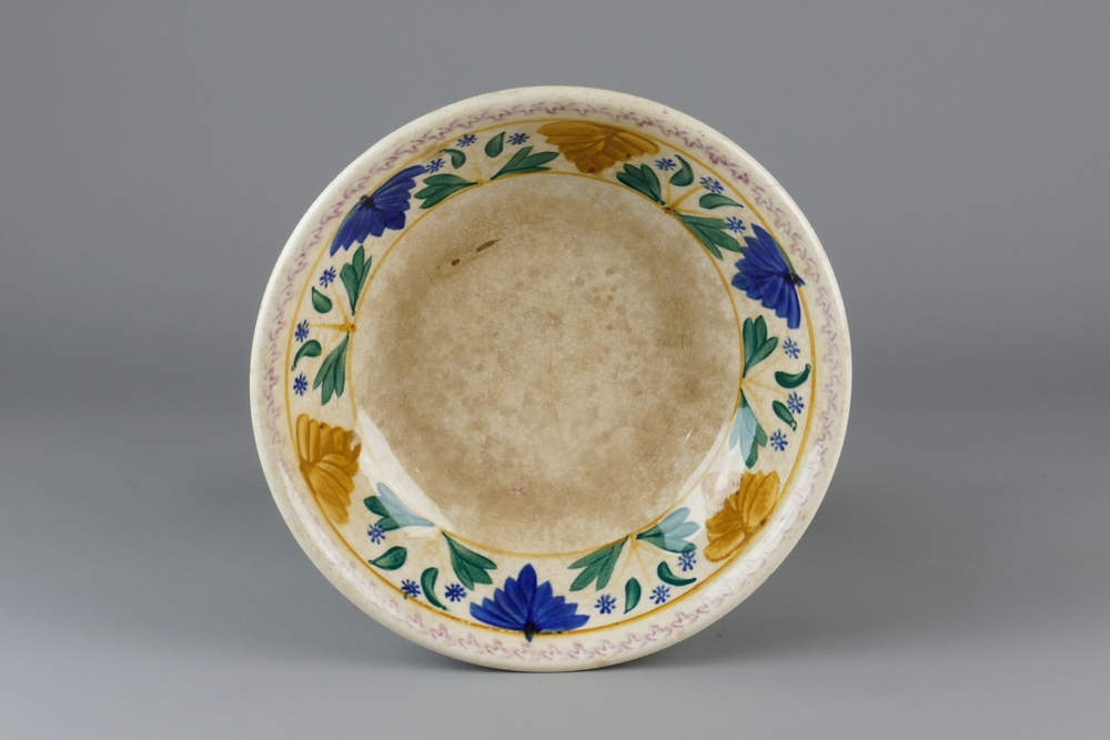 schaal van aardewerk, rand versierd met boerenbont, ...