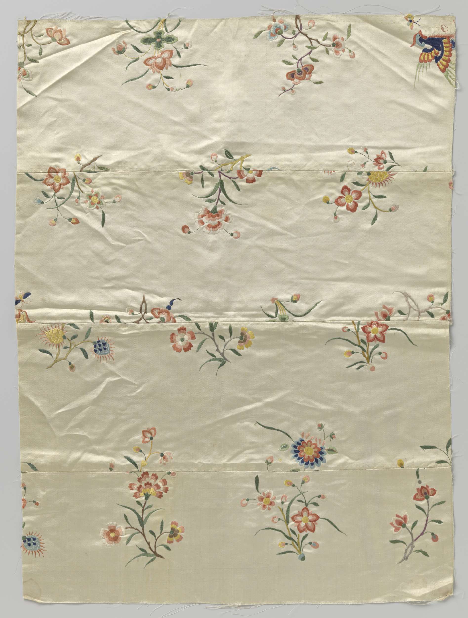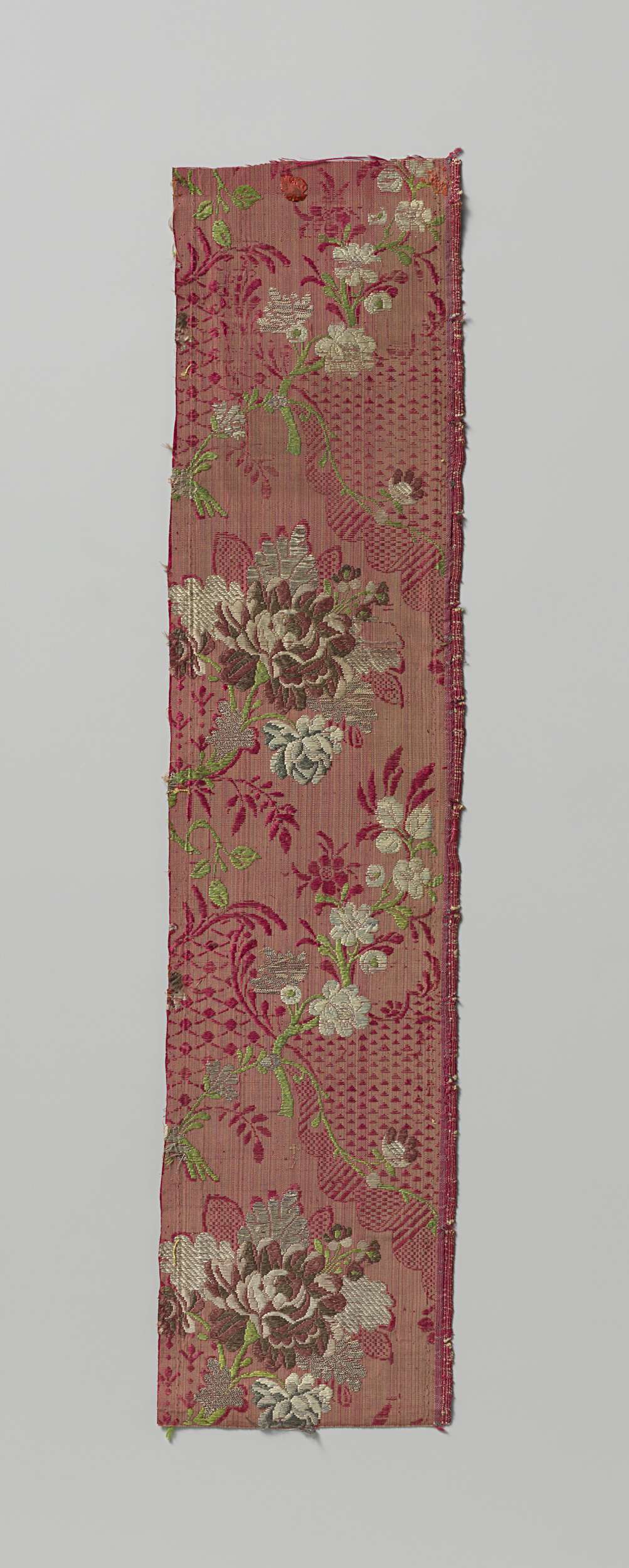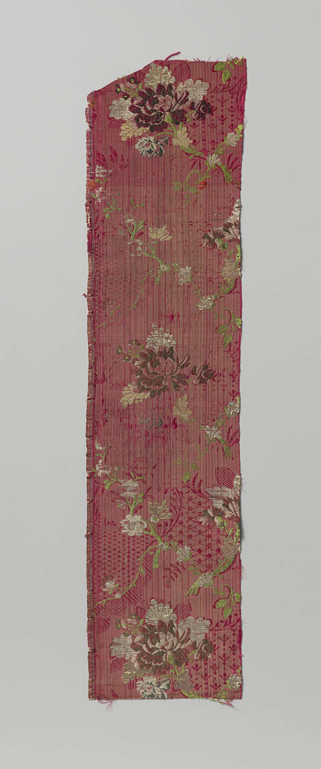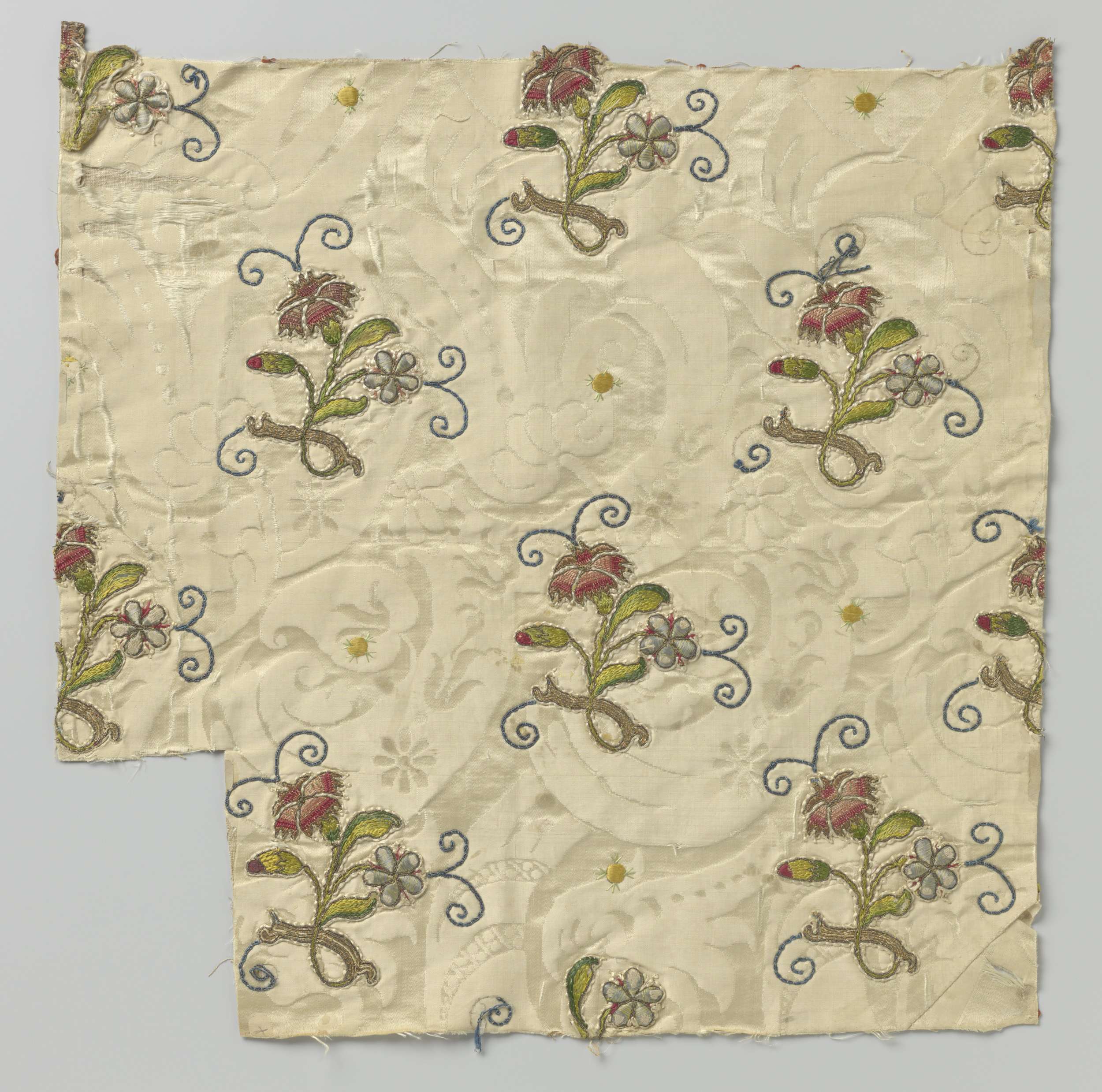 Fragment zijdedamast met opgeborduurde bloemtakken