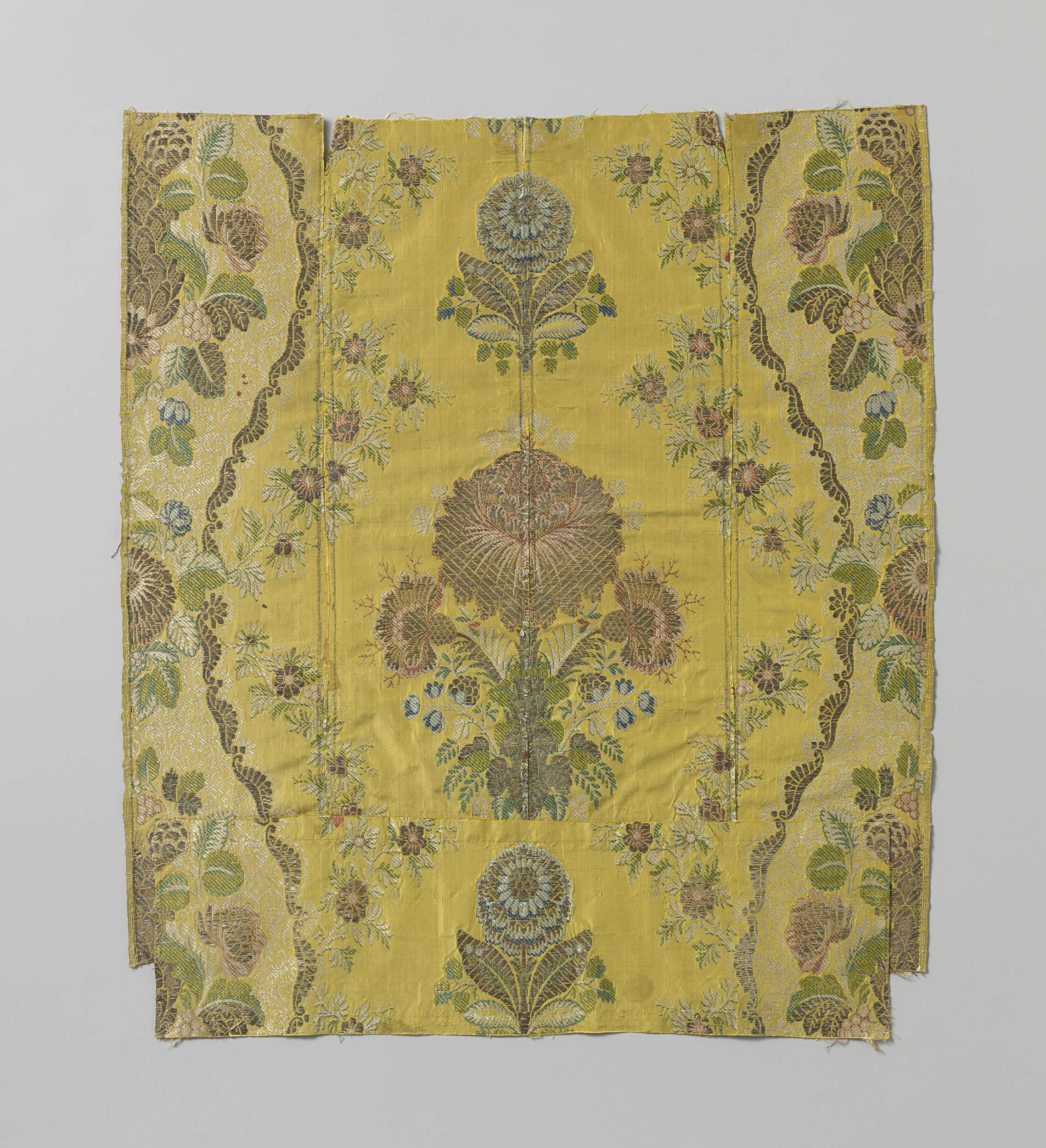 Fragment gebrocheerde gele zijde met veelkleurig pat...