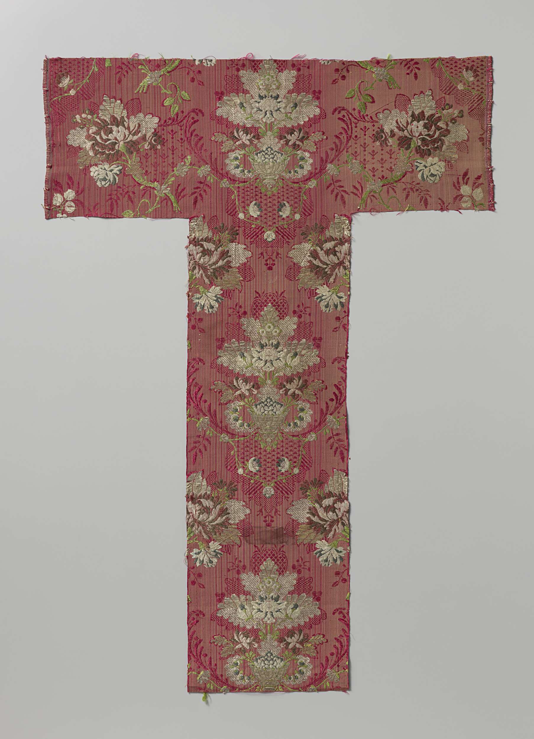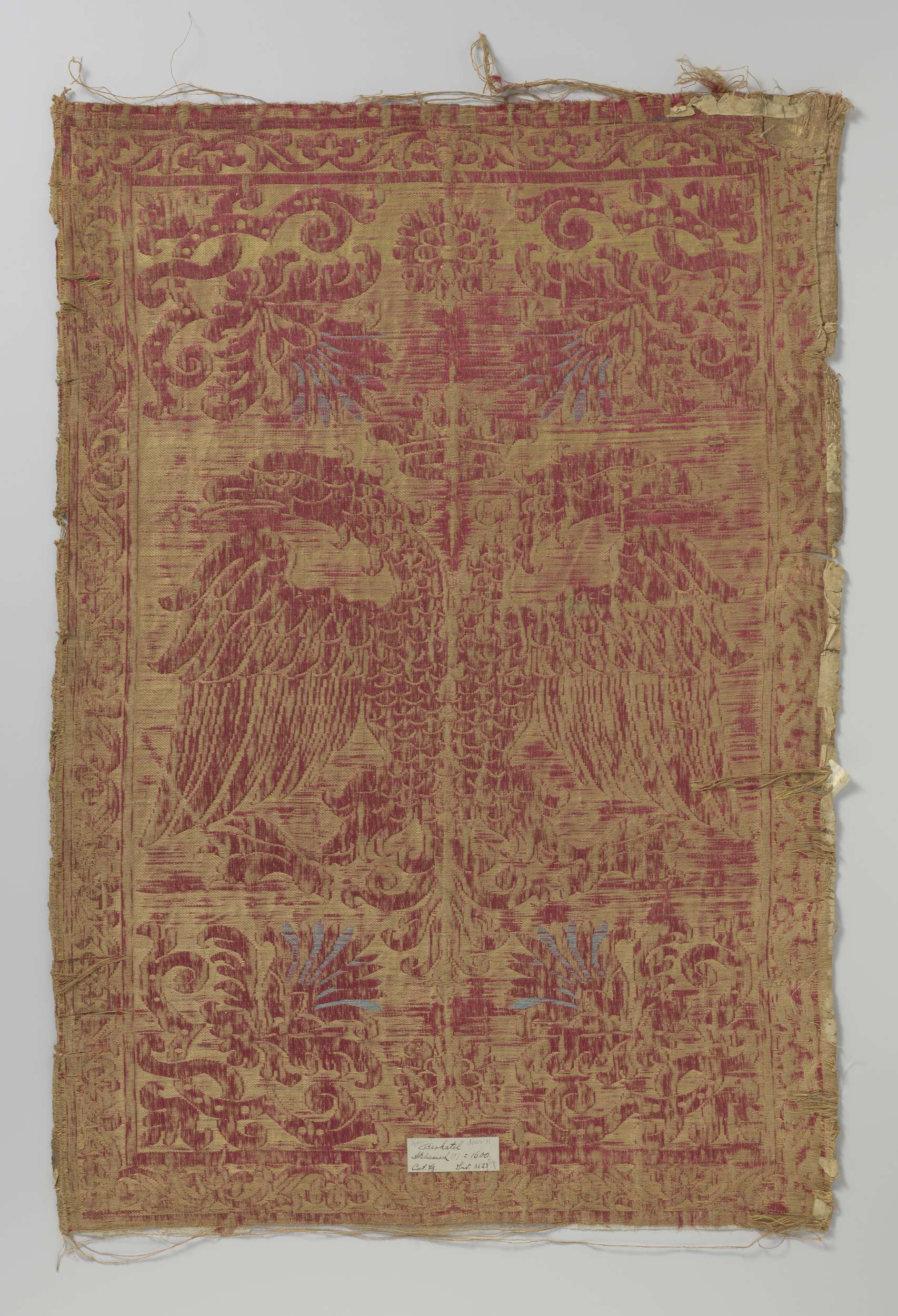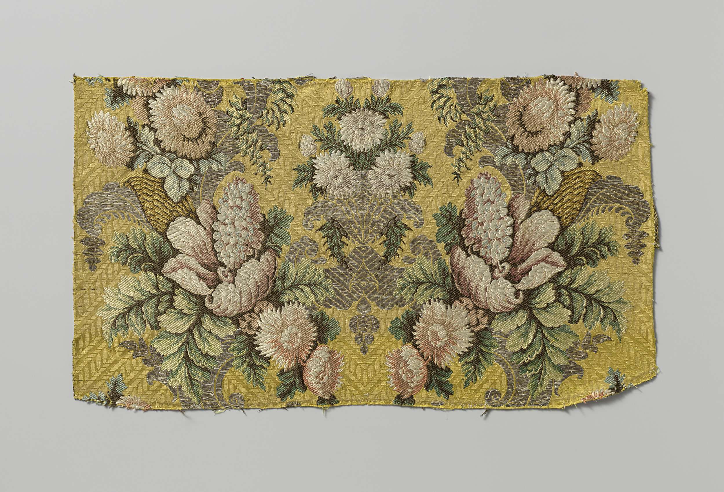 Fragment of doek van gele en rode satijnbrokaat met ...