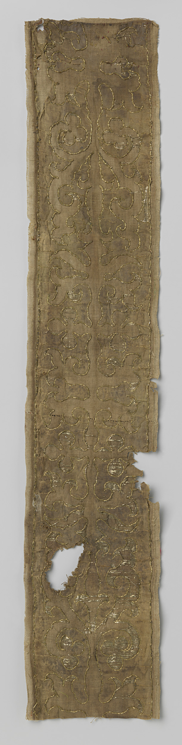 Band van linnen waarop ornamenten van gouddraad en z...