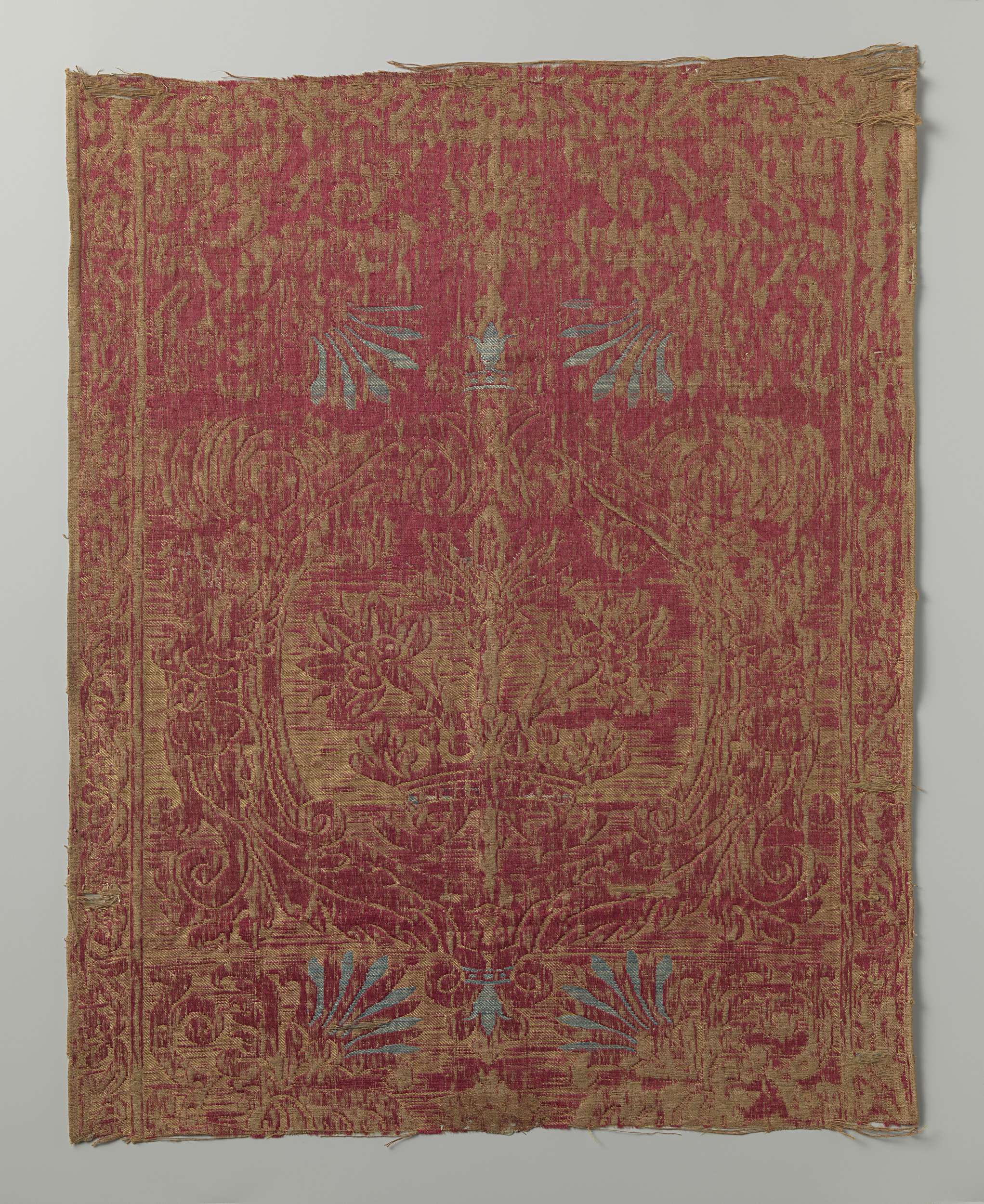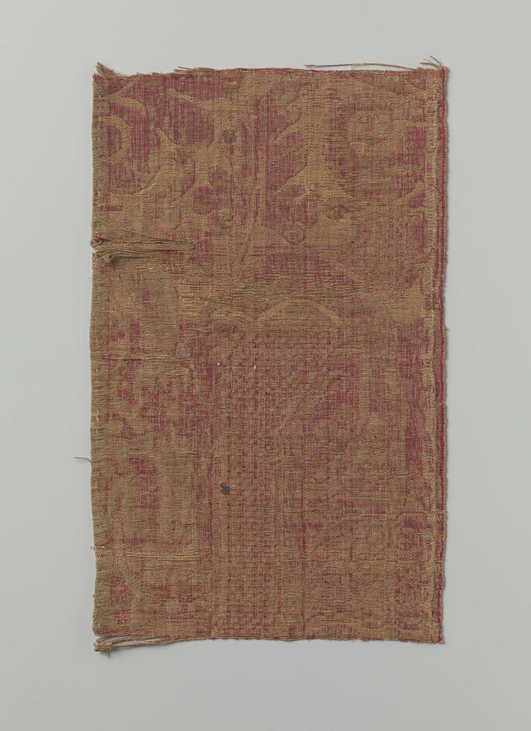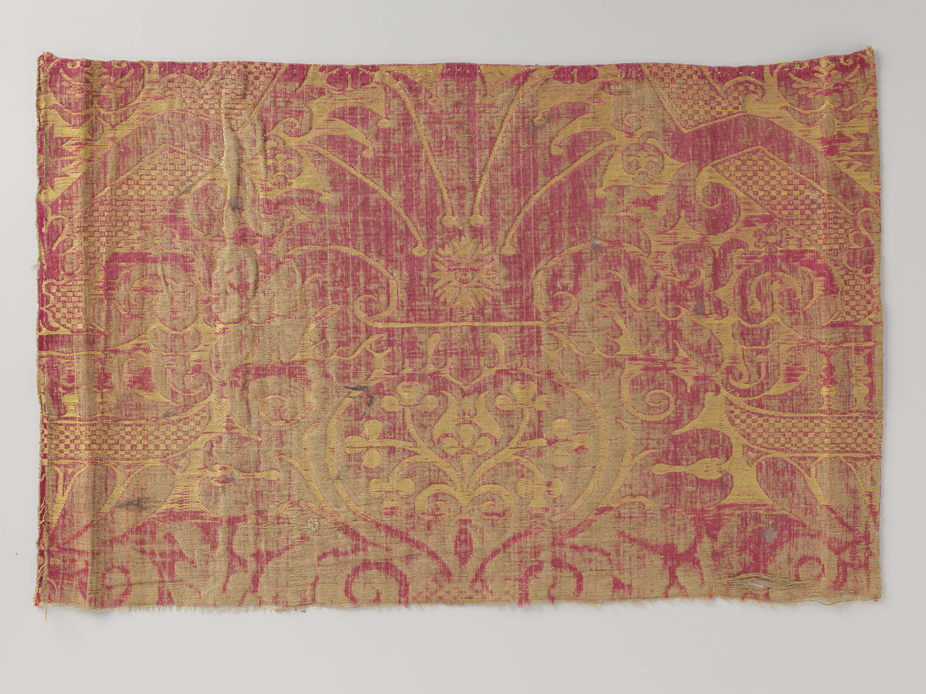 Fragment geel met rode zijdebrocatel met patroon van...