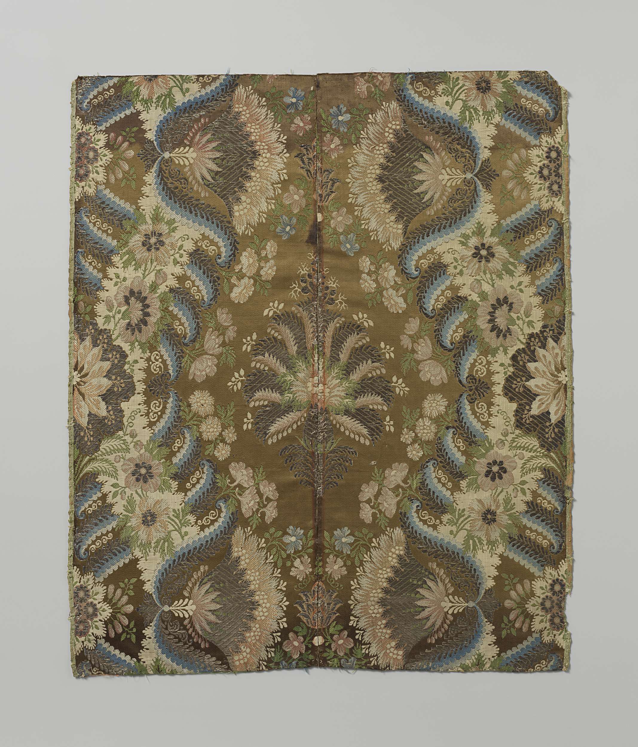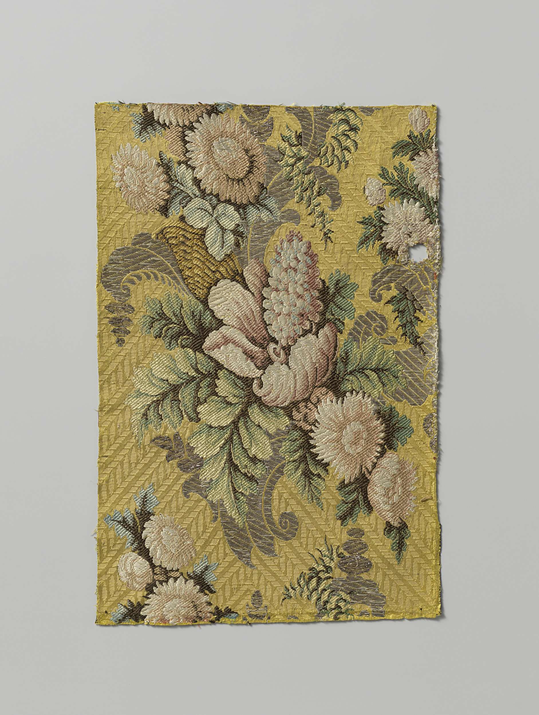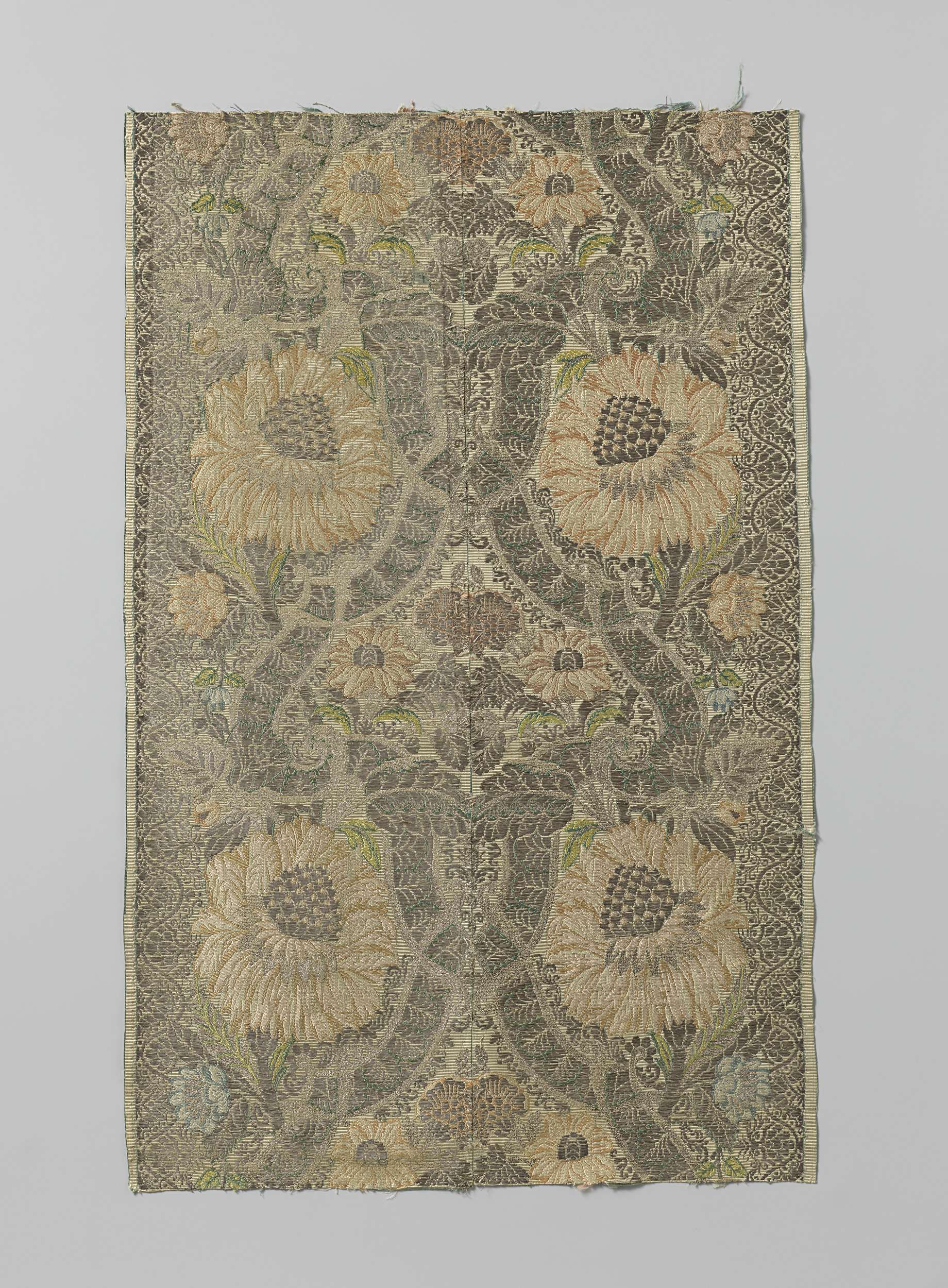 Fragment zijden zilverbrokaat met patroon van pioenr...