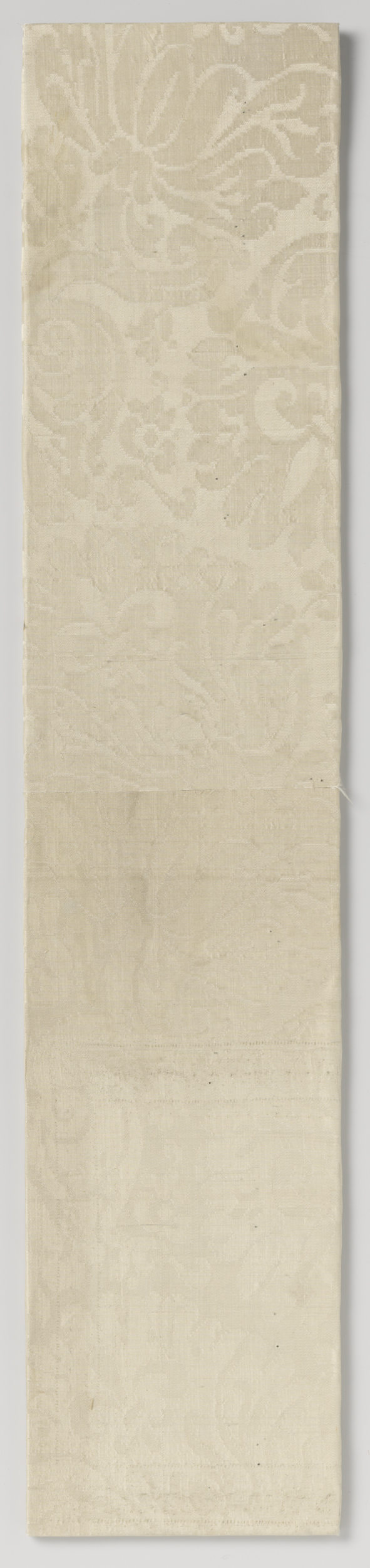 Fragment witte zijdedamast met patroon van telkens t...