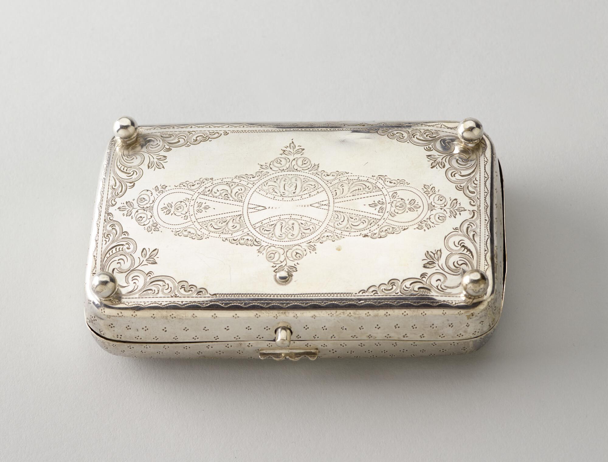 Zilveren tabaksdoos met afbeelding van de poolschoen...