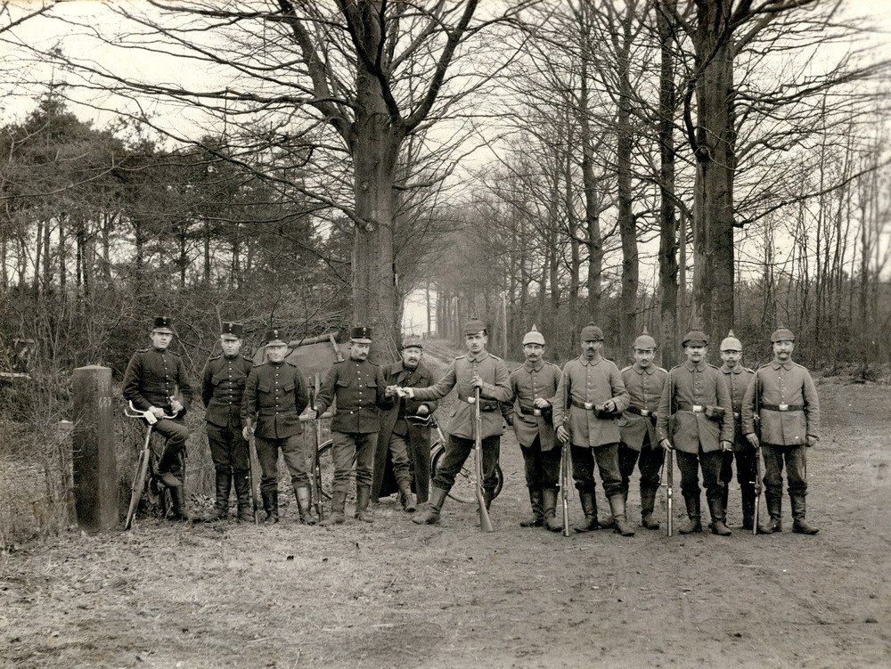 Zwart-wit foto van een groep militairen op landgoed ...