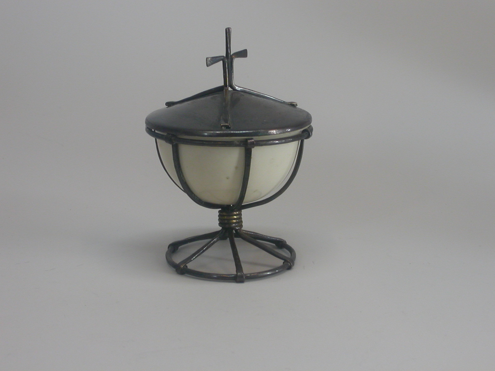 Wit keramieken zoutvaatje in metalen houder op voet ...