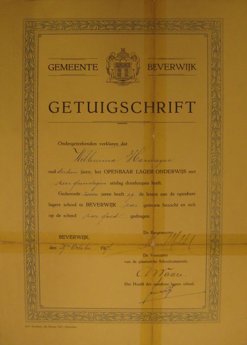 Getuigschrift Willemina Harmeijer 1917