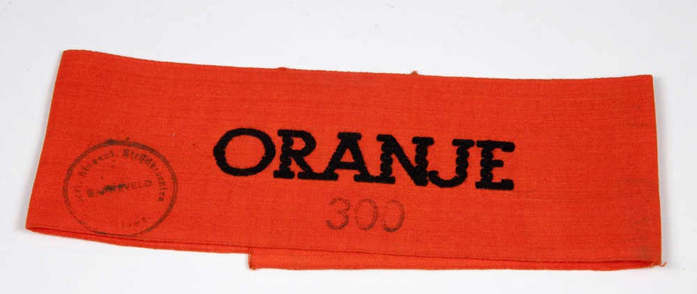 Oranje band met opschrift 'ORANJE' en stempel Binnen...