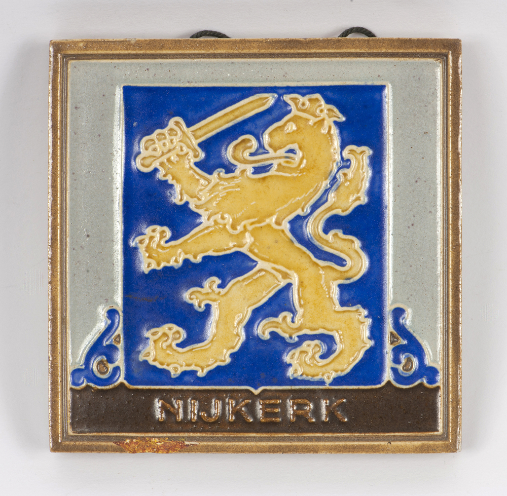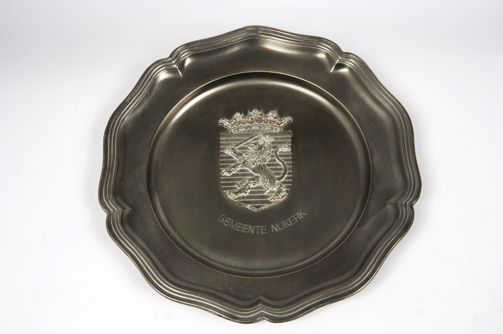 Tinnen sierbord met daarop het wapen van Nijkerk