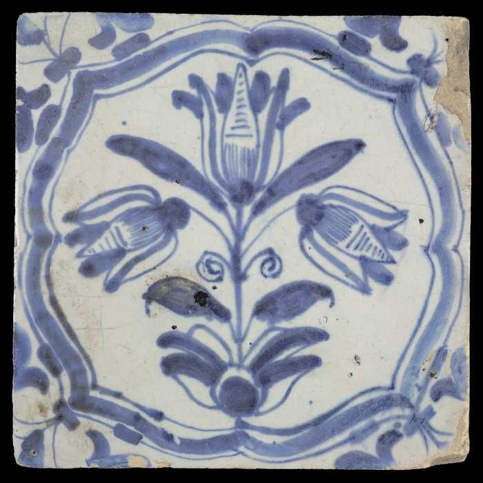 Bloemtegel met drietulp in accolades, blauw decor op...