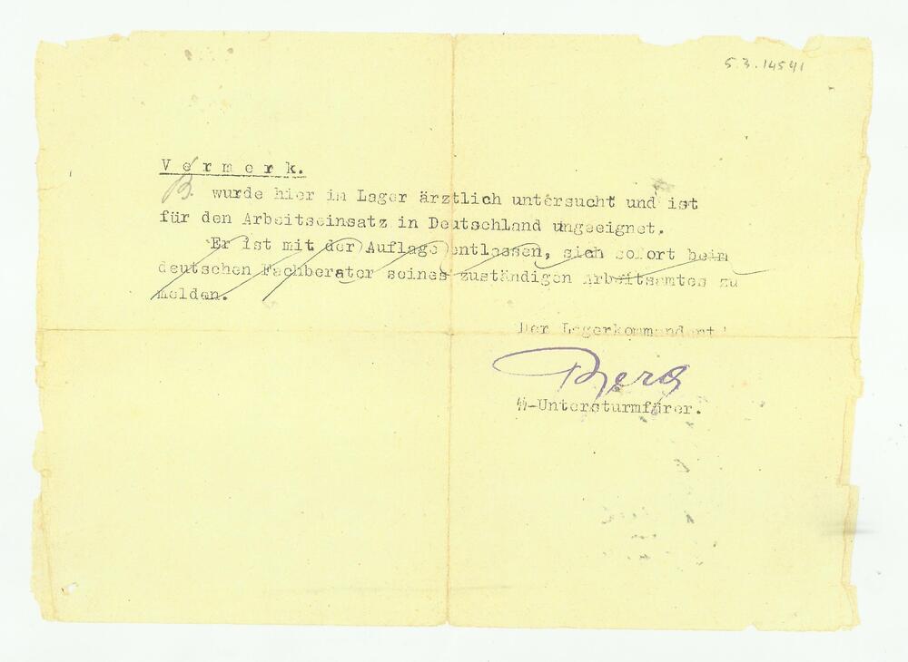 "Vermerk" dat B in het kamp medisch onderzocht werd ...