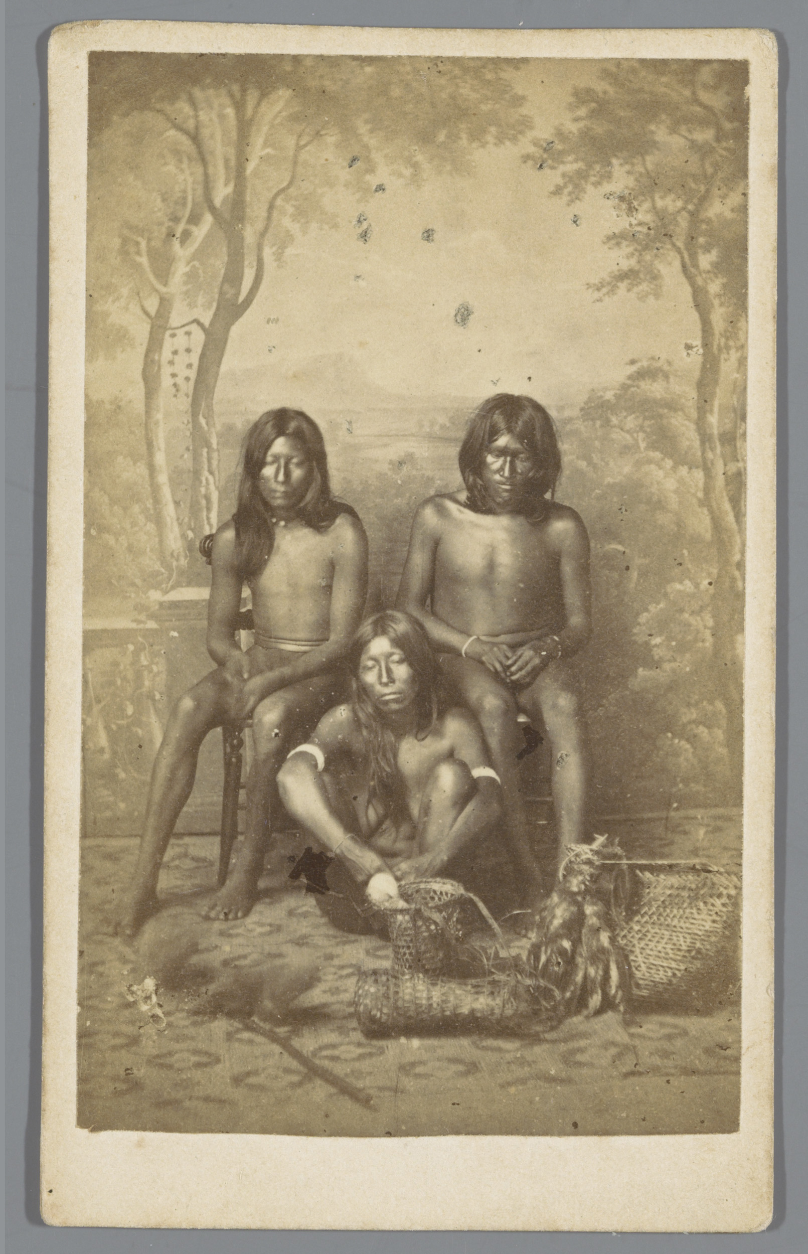 Portret van drie onbekende Surinaamse Arowakken tege...