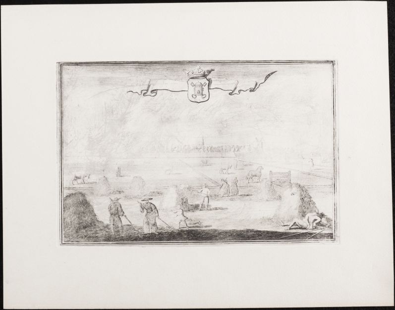 Afdruk van koperplaat met gezicht op Sloten, over we...