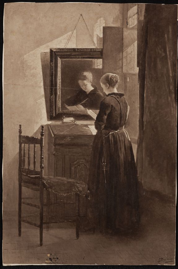 Vrouw leest brief staande voor een spiegel, naar een...