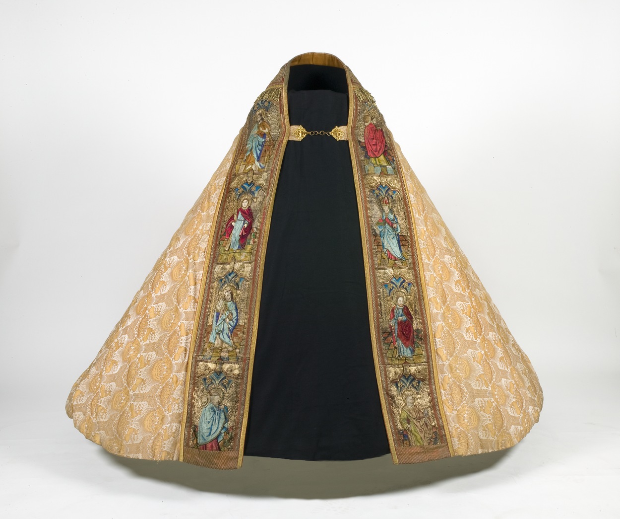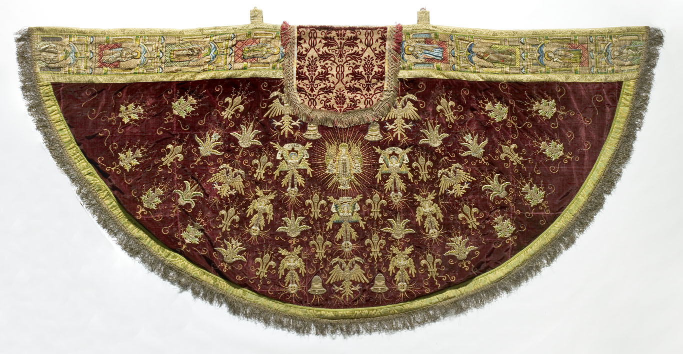 Rode koorkap met geborduurde apostelfiguren, engelen...
