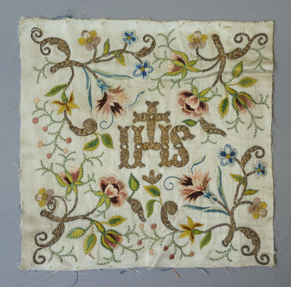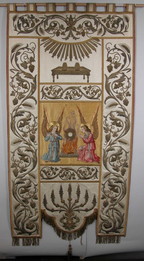 Crème sacramentsvaandel met applicaties, met IHS in ...