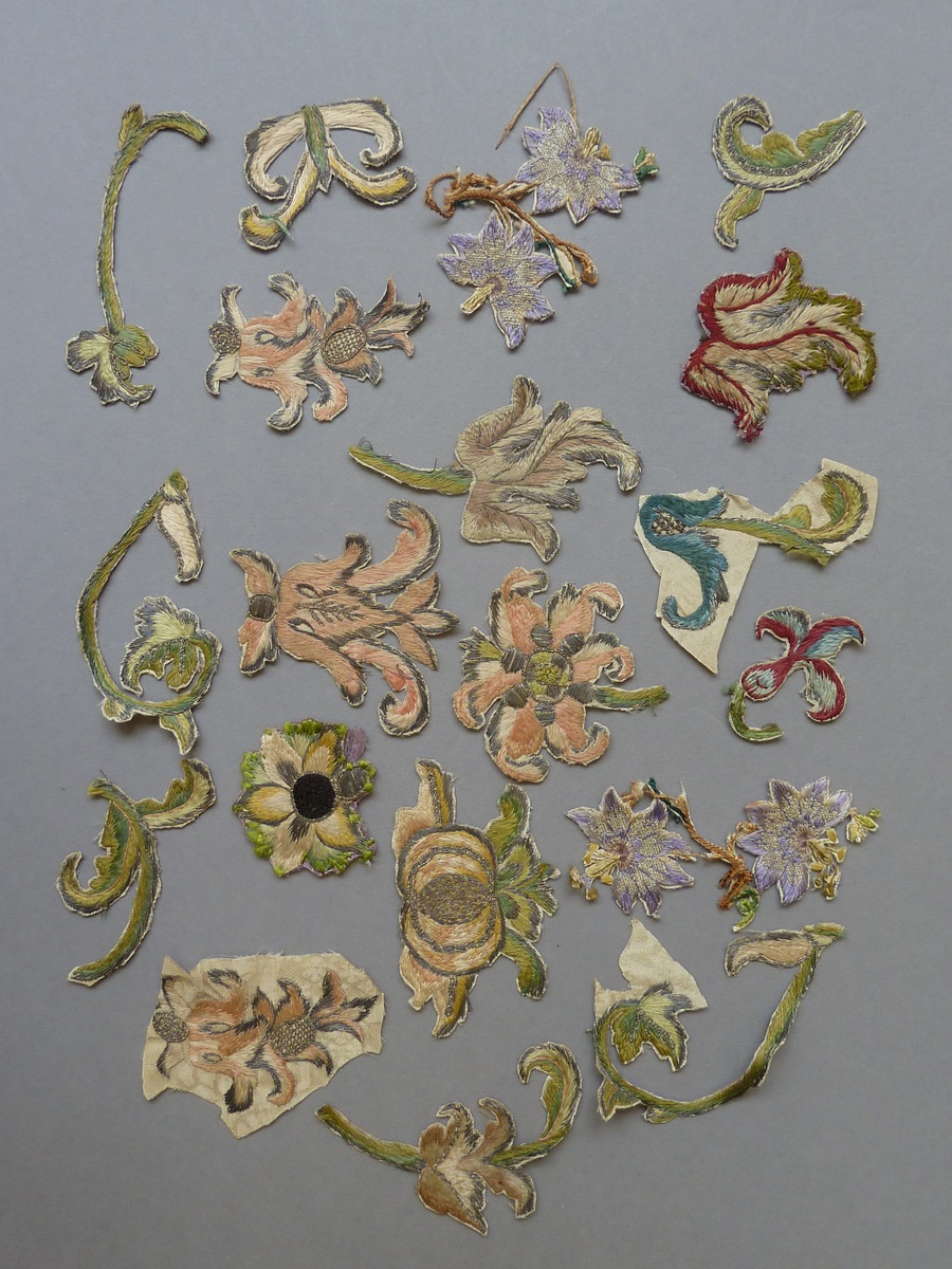 Vele kleine borduursels met lelies en andere bloemmo...